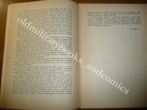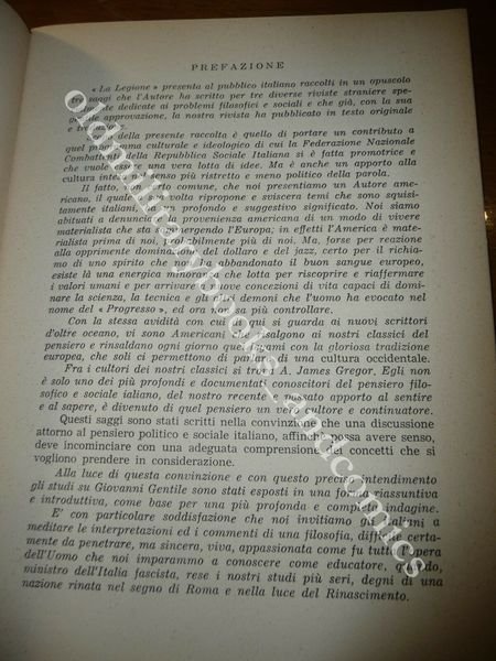DESCRIZIONE: Unione Tipografica Editrice Piacentina, Piacenza per iniziativa de LA LEGIONE 1970 br. ed. pp. 47 in 8°. Il vol. contiene: LA FILOSOFIA POLITICA DI GIOVANNI GENTILE; UN SISTEMA DI ETICA FASCISTA; TEORIA SOCIALE NELL'ITALIA FASCISTA. Il vol. è stato ristampato nel 2010. Gregor, nato Anthony Gimigliano, si è laureato alla Columbia University nel 1952. Nel 1961 divenne docente associato di filosofia all'University of Hawaii e nel 1964 di Kentucky e Texas. Dal 1967 è al dipartimento di Scienze politiche dell'Università di Berkeley in California, di cui oggi è professore emerito. Ha dedicato la sua attività di studioso soprattutto all'ideologia del fascismo, producendo inoltre numerose monografie su importanti personalità che ad essa diedero il proprio contributo. Ha condotto ricerche anche sul marxismo e il neofascismo. La filosofia politica è nello stesso tempo uno dei settori più importanti e più trascurati del mondo filosofico. Nessun altro campo di attività critica è altrettanto pieno di paradossi reali o apparenti. Esaminando il problema della subordinazione incontriamo subito le difficoltà che lo assillano. È questo problema appunto che ci fornisce un opportuno spunto per iniziare uno studio del pensiero politico di Giovanni Gentile. Uno dei problemi più urgenti per chi si occupa di teoria politica è quello della giustificazione morale dell’esercizio dell’autorità politica. In breve, come si può concepire l’Io, l’individuo, obbligato ad ubbidire alla autorità politica? Come si può pretendere che sacrifichi, anche in tempo di pace, il proprio interesse immediato e personale a favore delll'interesse collettivo? Come può, in tempo di guerra, essere legittimamente costretto a sacrificare la sua vita per il paese? Da quale fondamento discende questa subordinazione? CONDIZIONI: Ottime. PESO / WEIGHT: 91 gr. without package