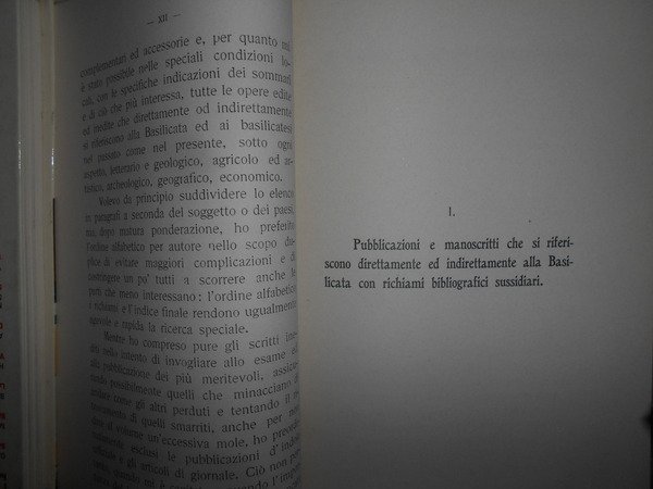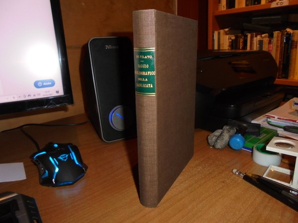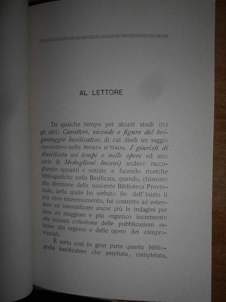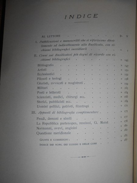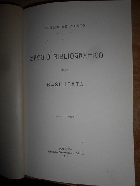 SERGIO DE PILATO. Potenza, Vincenzi Garramone, 1914. SAGGIO BIBLIOGRAFICO sulla BASILICATA. In-8° piccolo, tela marrone scuro con titolo in oro entro tassello al dorso, copertine originali conservate. XX + 196, pp. Br. ed Dall'indice: I - Pubblicazioni e manoscritti che si riferiscono direttamente ed indirettamente alla Basilicata, con richiami bibliografici sussidiarii. II - Cenni sui Basilicatesi piu' degni di ricordo con richiami bibliografici. III - Appunti di bibliografia complementare. Perfetto esemplare in prima edizione con legatura anni '70 e copertine originali conservate. Neg. Bol. mob. S