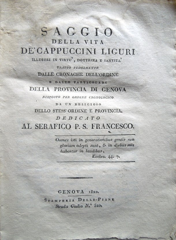 Saggio della vita de' Cappuccini liguri illustri in virtù, dottrina e santità tratto fedelmente dalle cronache dell'Ordine e dalle particolari della Provincia di Genova disposto per ordine cronologico da un religioso dello stess'Ordine e Provincia