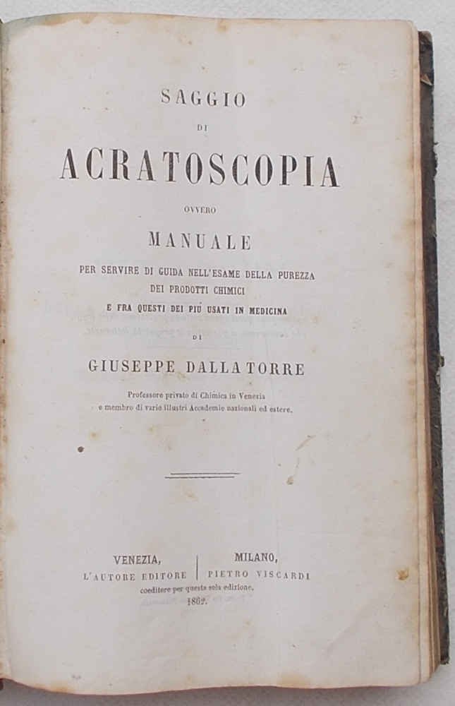 Saggio di acratoscopia ovvero manuale per servire di guida nell'esame della purezza dei prodotti chimici e fra questi dei più usati in medicina.