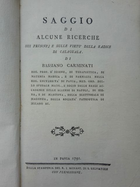 In-8° (cm. 20,3), legatura in pergamena rimontata, risguardi in carta marmorizzata settecentesca; pp. 109 [3] in ottimo stato. Edizione originale di una monografia sulla droga medicinale sudamericana, prima del Carminati già tentata dal botanico Gelmetti. Ottimo esemplare. (SL5)