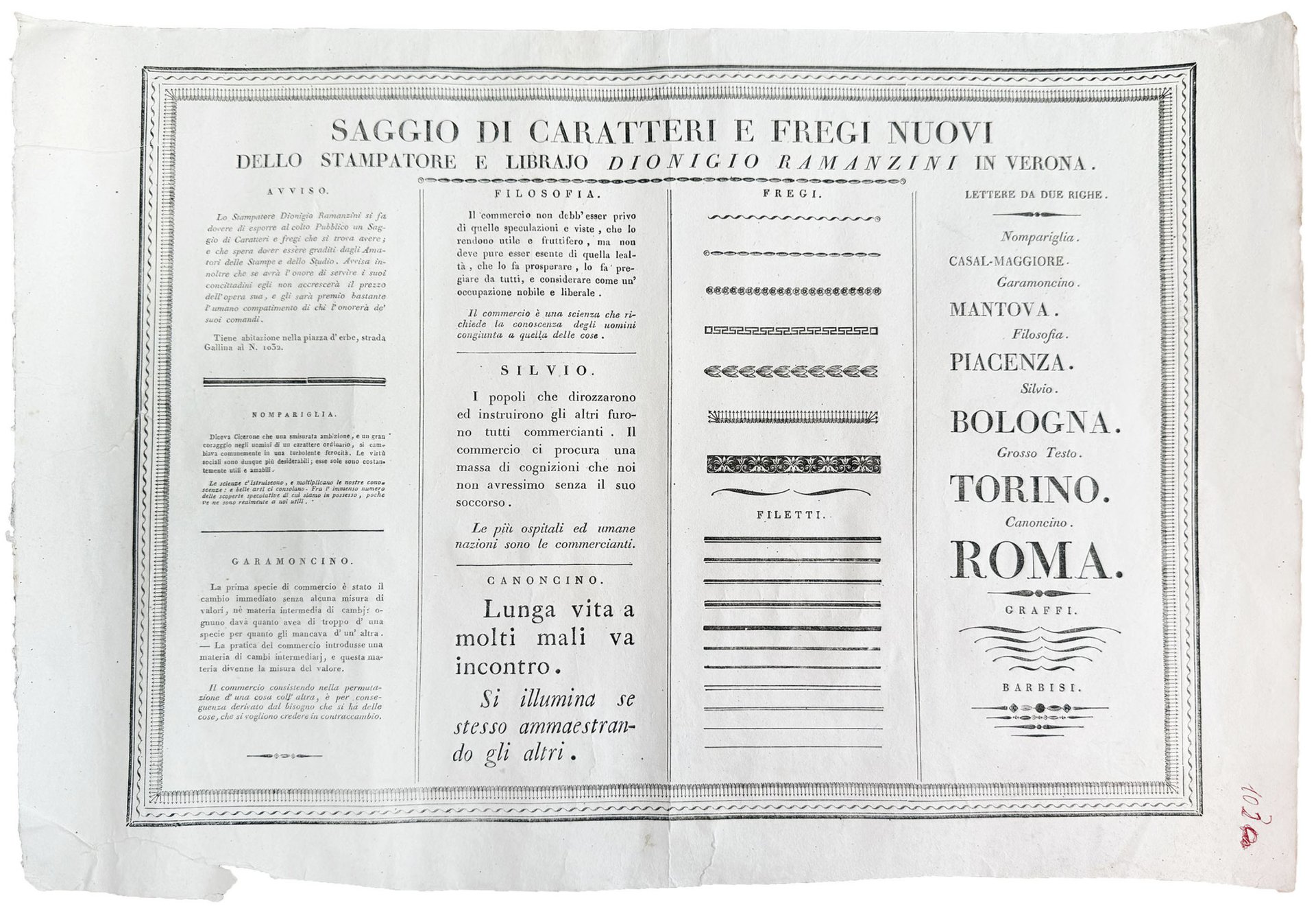 This is apparently an unrecorded type specimen of the Verona publishing house Dionisio Ramanzini, which was founded around 1729 and remained active almost seamlessly until the 1830s.