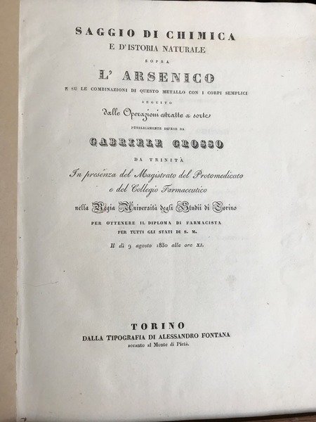 Fascicolo in 4, brossura muta, frontespizio, dedicatoria, 19 pp., bianca finale. A questo interessante saggio segue la descrizione di alcuni esperimenti eseguiti nel laboratorio di chimica farmaceutica: Ioduro di potassio; Cloruro di soda; Fosfato di soda o sale perlato catartico di Pearson; Sciroppo balsamico; Estratto d'Oppio acquoso; Tintura di Belzoino. Stampato su bella carta forte. Raro. In bello stato.