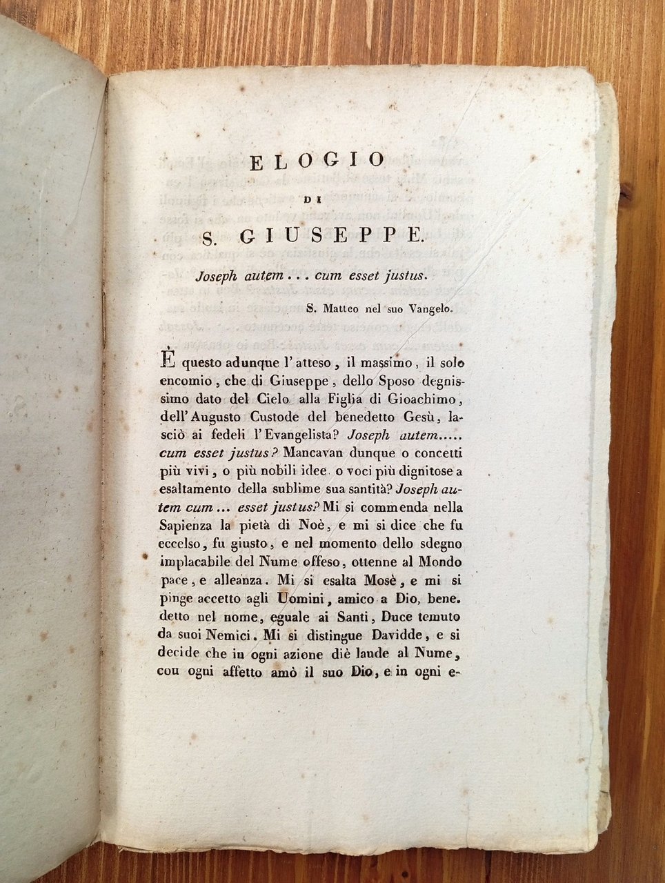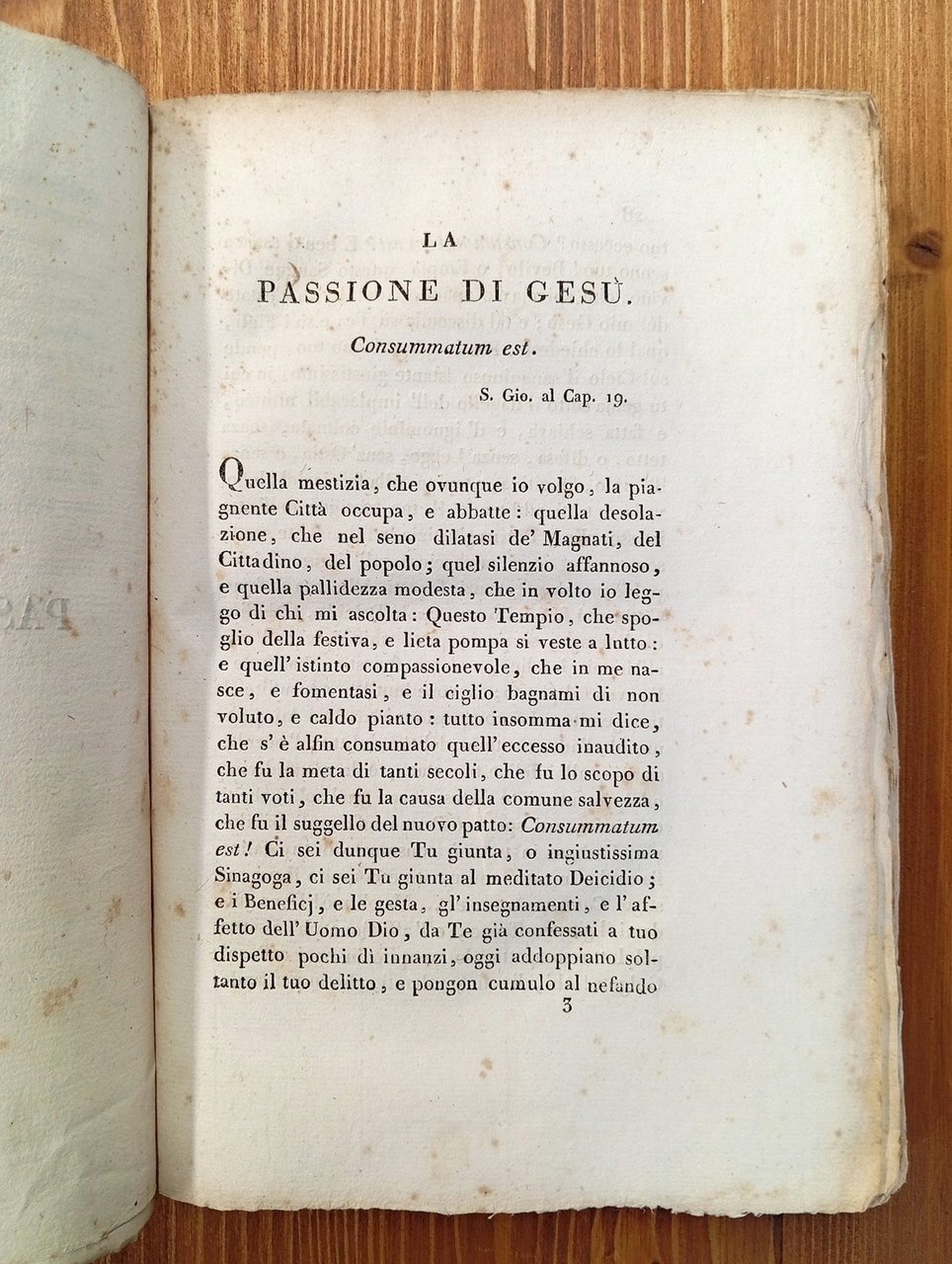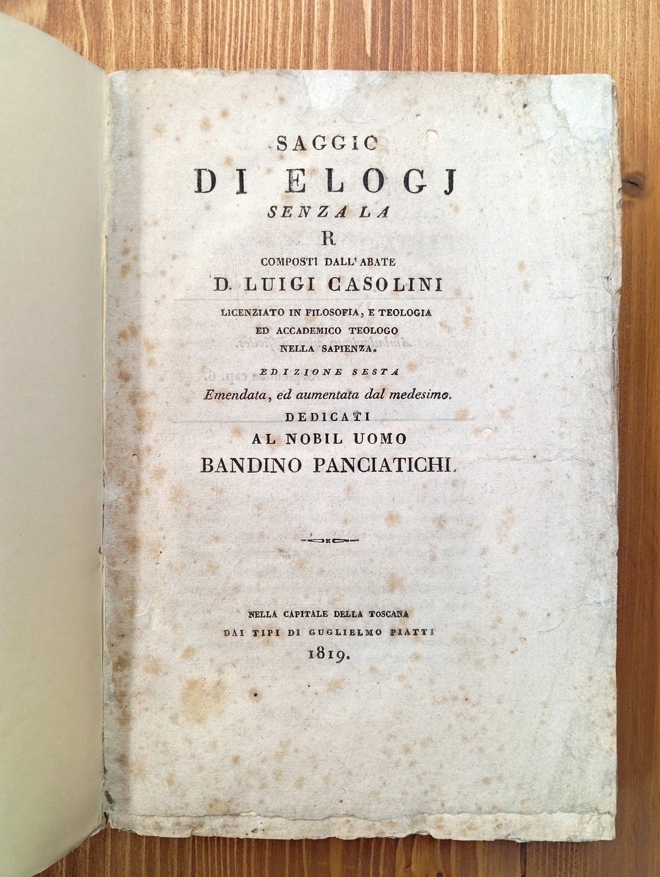 Brossura muta non originale decorata, xv-175 pagine stampate su carta a mano non rifilata. Fioriture e segni del tempo alle carte, nel complesso esemplare integro e ben conservato, fruibile in ogni sua parte. -- Si definisce "lipogramma" un'opera letteraria, un componimento poetico in cui, per artificio retorico, si omettono intenzionalmente tutte le parole in cui compare una determinata lettera o gruppo di lettere. In questi suoi sermoni, l'abate Luigi Casolini non vi ricorse per una questione stilistica ma, avendo la erre moscia, lo scelse per evitare d'essere deriso all'interno del suo ambiente intellettuale. Ne risulta, in ogni caso, un curioso e notevole esercizio di eloquenza devozionale, non esente da poetismi proprio a motivo della forzosa omissione della lettera R.
