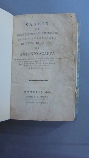 VENEZIA, PEZZANA, 1805. In 16∞: pp. VII + 344. Con 3 tavole ripieg. pi˘ volte f.t. con lievi mende, raffiguranti dettagliate parti anatomiche dell`occhio e della scatola cranica. La prima tavola risulta riparata al rovescio, mentre la terza presenta un forellino centrale, manca il ritratto dell`Autore all`antiporta. Aloni di vecchia umidit‡, fragilit‡ alle prime pagine. Probabile 2a ediz.veneta (la prima ediz. apparve a Pavia nel 1801. La prima veneta apparve nel 1802; cfr. Hirsch V p. 45, Brunet V. Garrison & Morton, etc.). Leg. in cart. moderno con tass. dorato al dorso.