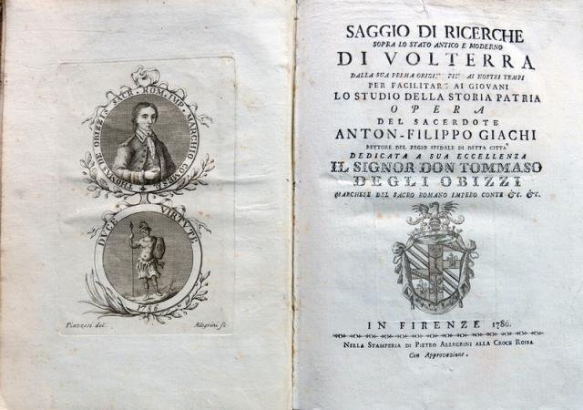 Saggio di ricerche sopra lo stato antico e moderno di Volterra. Dalla sua prima origine fino ai nostri tempi per facilitare ai giovani lo studio della storia patria. Opera del sacerdote Anton – Filippo Giachi Rettore del Regio Spedale di detta città. Dedicata a Sua Eccellenza Signor Don Tommaso degli Obizzi marchese del Sacro Romano Impero Conte ecc. ecc.