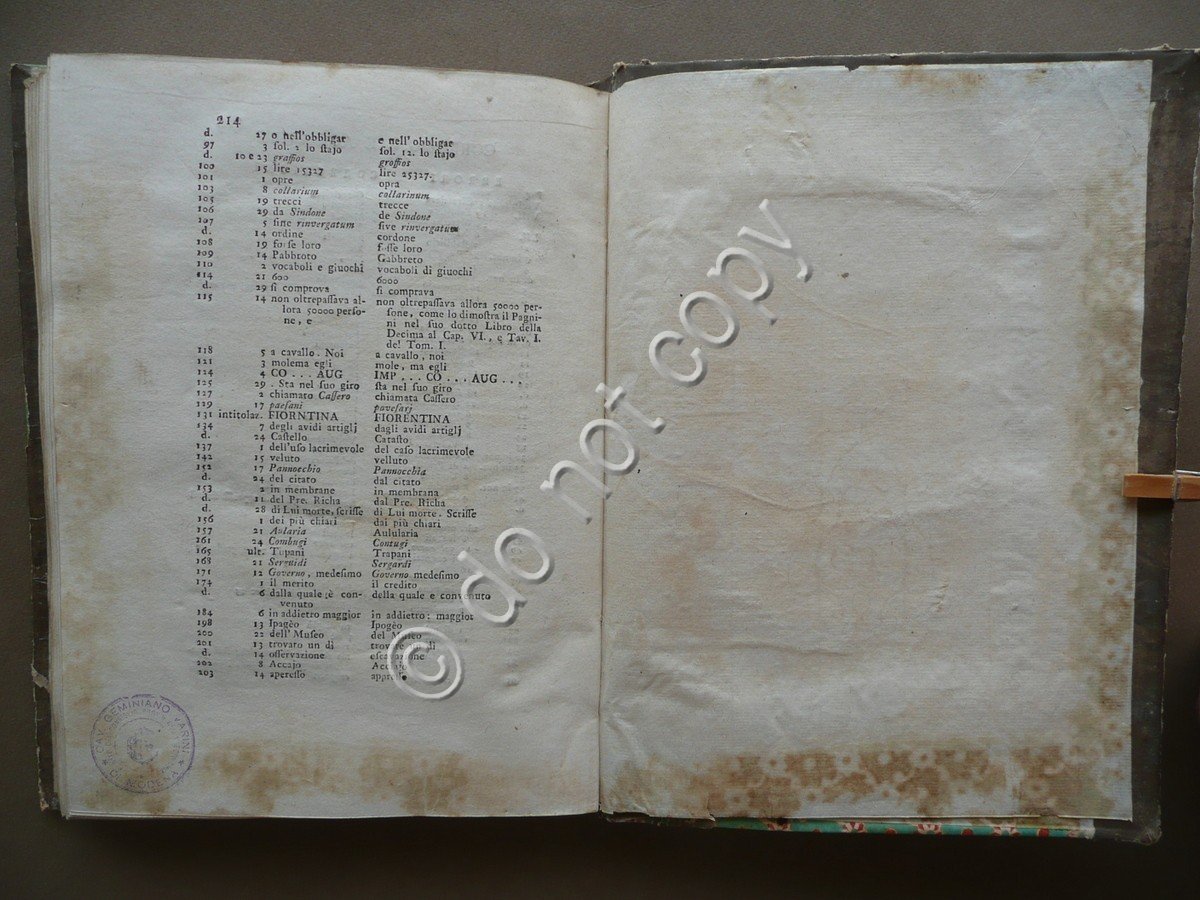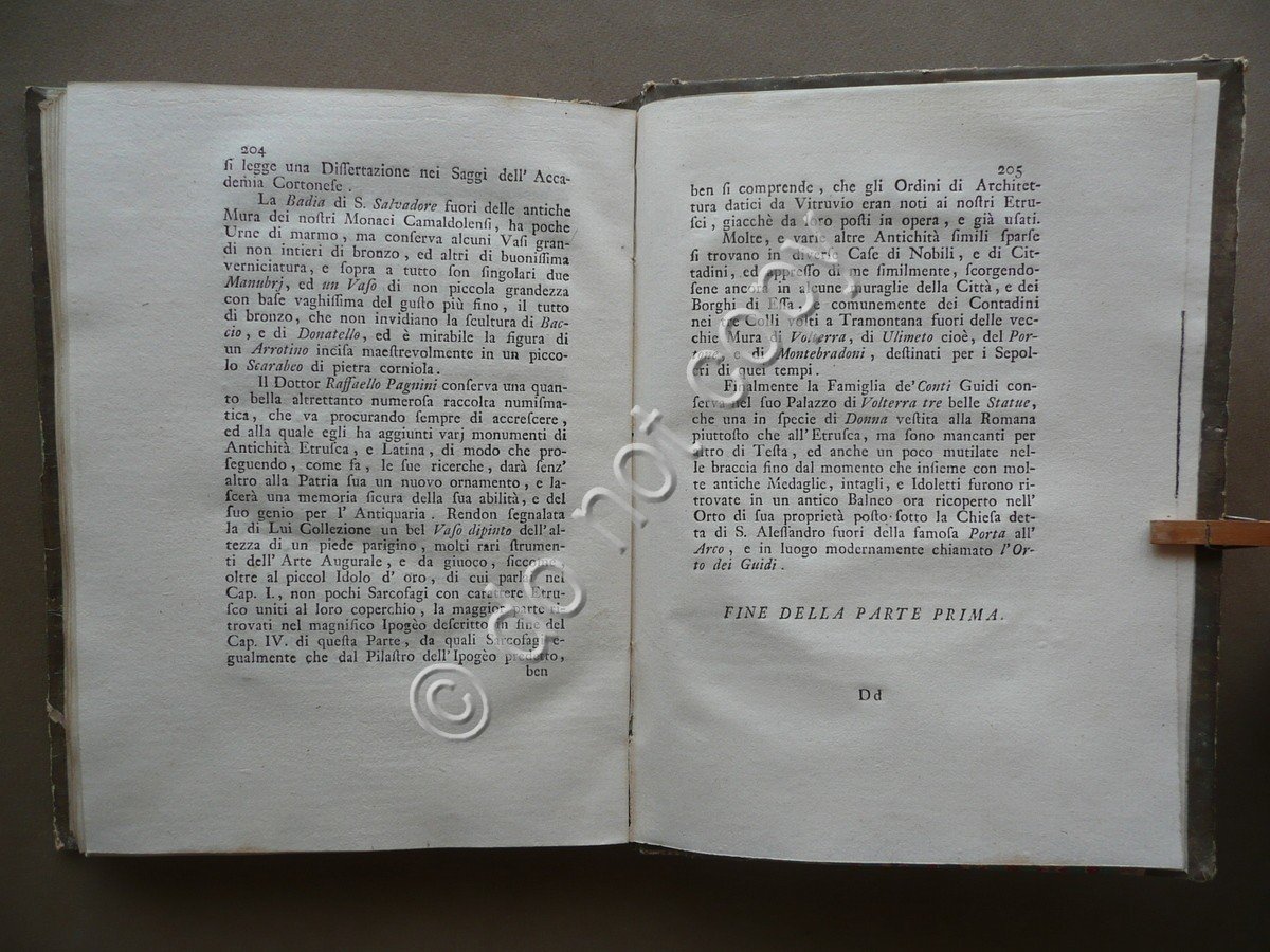 Anton Filippo Giachi, Saggio di ricerche sopra lo stato antico e moderno di Volterra dalla sua prima origine fino ai nostri tempi per facilitare ai giovani lo studio della storia patria opera del sacerdote Anton-Filippo Giachi Rettore del Regio Spedale di detta città dedicata a sua eccellenza il Signor Don Tommaso degli Obizzi Marchese del Sacro Romano Impero, Conte, ecc. ecc. parte prima Nella Stamperia di Pietro Allegrini alla Croce Rossa, in Firenze 1786, cm 24,5x18, pp. [1]; I-XV; 1-214; [1] con capolettera inciso alla dedicatoria, frontespizio con bel fregio inciso, mancanza dell'antiporta figurata (due piccoli medaglioni: uno con ritratto del Marchese Tommaso degli Obizzi, l'altro allegorico), interni marginosi e in carta forte; bella legatura coeva in tutto cartonato rivestito in varesina d'epoca, titolo manoscritto entro etichetta applicata alla cuffia sup. Frontespizio e ultima pagina con timbro di vecchia biblioteca privata. Esemplare non completo. Condizioni di conservazione Esemplare in buone condizioni con tracce d'uso, coperta con alcuni piccoli strappetti e minimi difetti al dorso, ai margini e agli angoli dei piatti, cuffia inf. con piccole tracce di vecchia applicazione (probabilmente pecetto o etichetta). Interni buoni, contropiatti, margini delle carte bianche, del frontespizio e delle pp. 213-214 con leggere bruniture e qualche lieve traccia di vecchia umidità, prima bianca con strappo di alcuni cm al margine interno, contropiatti con pochi piccoli danni da tarlo che non interessano il corpo del testo, il quale è complessivamente molto ben conservato. Interessante trattato sulla fondazione della città di Volterra. Opera non completa (mancanza della seconda e della terza parte, pubblicate in Siena rispettivamente nel 1796 e 1798). Alla suddetta prima parte manca l'antiporta figurata (due piccoli medaglioni, uno con ritratto del Marchese Tommaso degli Obizzi, l'altro allegorico). Peraltro bell'esemplare in carta forte con bella legatura coeva in cartonato e rivestita in varesina" d'epoca. SETT75.L6672 N "