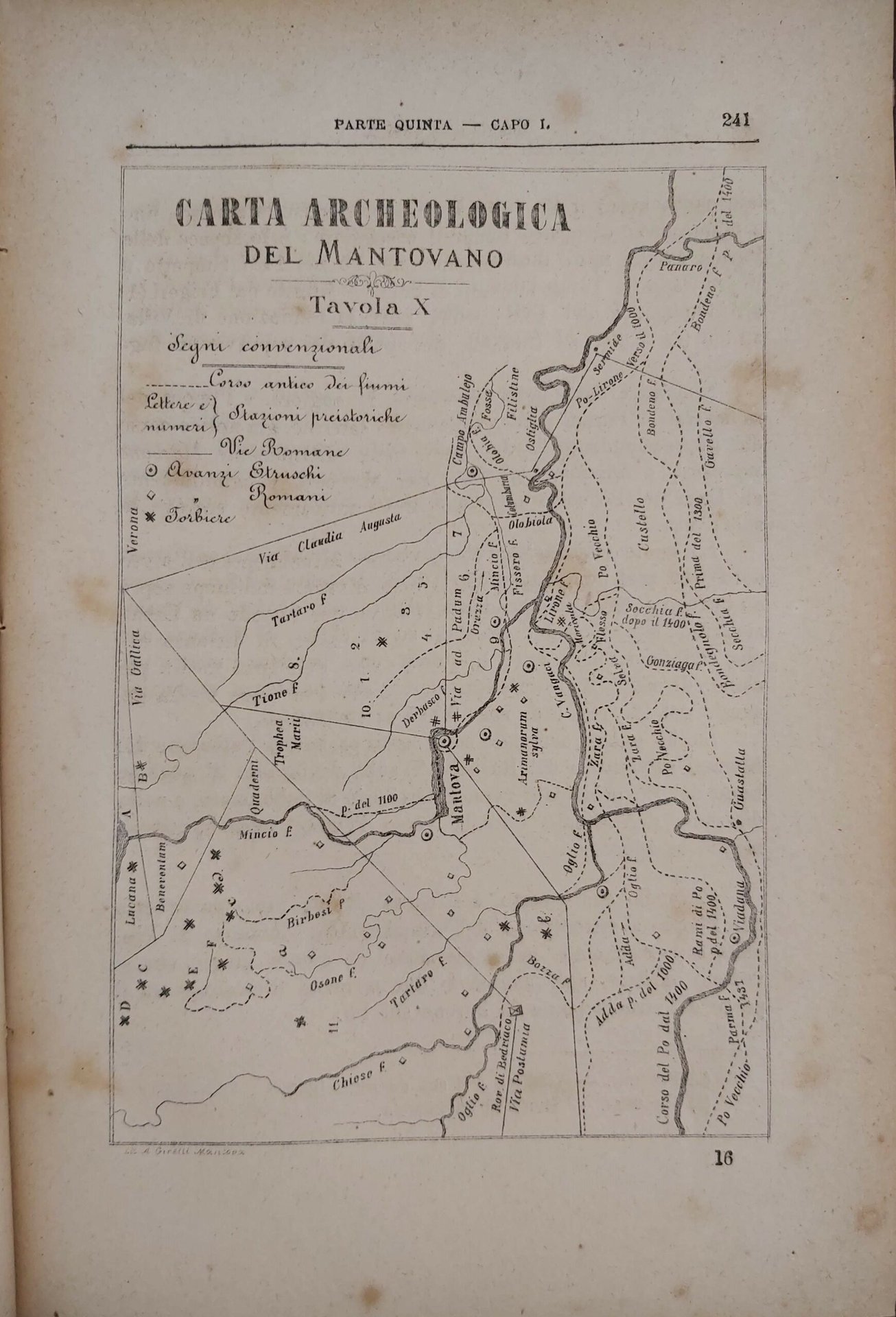 gr. vol. in-4, pp. IV, 507, IX, leg. cart. edit. Con 12 tavv. litogr. tra cui una carta igrografica del mantovano, e altre 19 gr. figg. n.t. Fondamentale opera di scienze naturali e geologiche che interessa il territorio della valle del Po nel mantovano. Grande rilievo viene dato alla sezione idrologica, con lo studio dei fiumi principali ma anche dei canali di irrigazione e scoli. In particolare l'A. a dare, per primo tra gli studiosi, spiegazione delle acque salmastre del Sermidese. Nella seconda parte è contenuta la parte geologica con la suddivisione delle zone argillose da quelle cretose, laghetti e torbiere, composizione delle colline moreniche, e cenni di paleontologia (conchiglie e ritrovamenti fossili), archeologia ed etnografia. Infine sono riportate notizie sulla flora e fauna con un ampio catalogo degli animali indigeni e vegetali spontanei. Bell'esempl. [270]