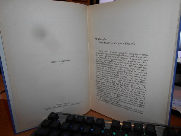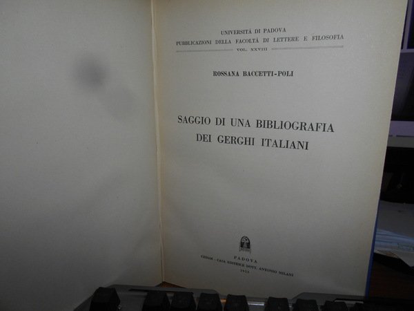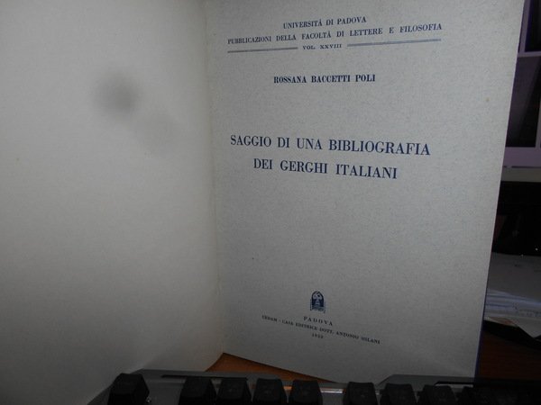 Rosanna Baccetti Poli. Padova, CEDAM, 1953. SAGGIO DI UNA BIBLIOGRAFIA DEI GERGHI ITALIANI. In-8°, tela bleu con titolo in oro entro tassello al dorso, copertine originali conservate. xxiv, 210, (2) pp. In ottimo stato di conservazione in legatura recente con le brossure originali conservate. Uff. A - II - 4 - 2