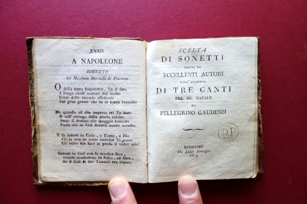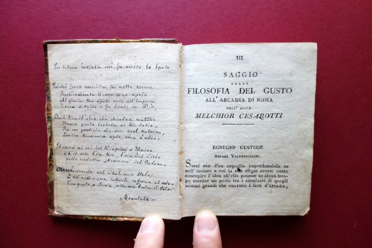 Melchiorre Cesarotti - Pellegrino Gaudenzi - Giuseppe Parini, Saggio sulla Filosofia del Gusto all'Arcadia di Roma pi√π sonetto A Napoleone" dell'Abate Melchior Cesarotti *** Scelta di sonetti tratti da eccellenti autori, coll'aggiunta di tre canti pel ss. Natale di Pellegrino Gaudenzi *** Il Lauro Novella di Giuseppe Parini Dalla Tip. Sonzogni, Bergamo 1809; cm 11,5x8,5; pp. XXXII-166; legatura d'epoca in mezza pelle (dorso e angoli) con titolo e fregi impressi in oro al dorso (titolo entro tassello). Ex libris ai frontespizi. Condizioni di conservazione Esemplare in buone condizioni con tracce d'uso, coperta con qualche marginale mancanza al rivestimento ai piatti e minuscole abrasioni alle cuffie. Interni buoni con qualche piccola lieve brunitura; margine esterno delle pp. 111-166 con una piccola leggera ombra di gora che non interessa il testo. Al margine inf. dei sonetti annotato a matita il nome del corrispettivo autore; note rimovibili (vedi foto). Al retro del frontespizio sonetto annotato a penna. Raccolta antologica di varie opere poetiche / letterarie. SETT4.L19968 N P "