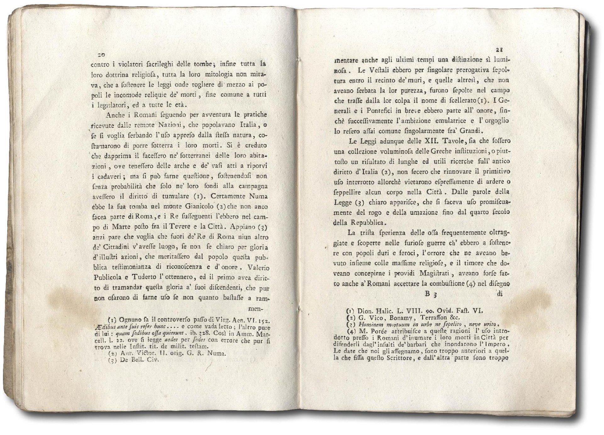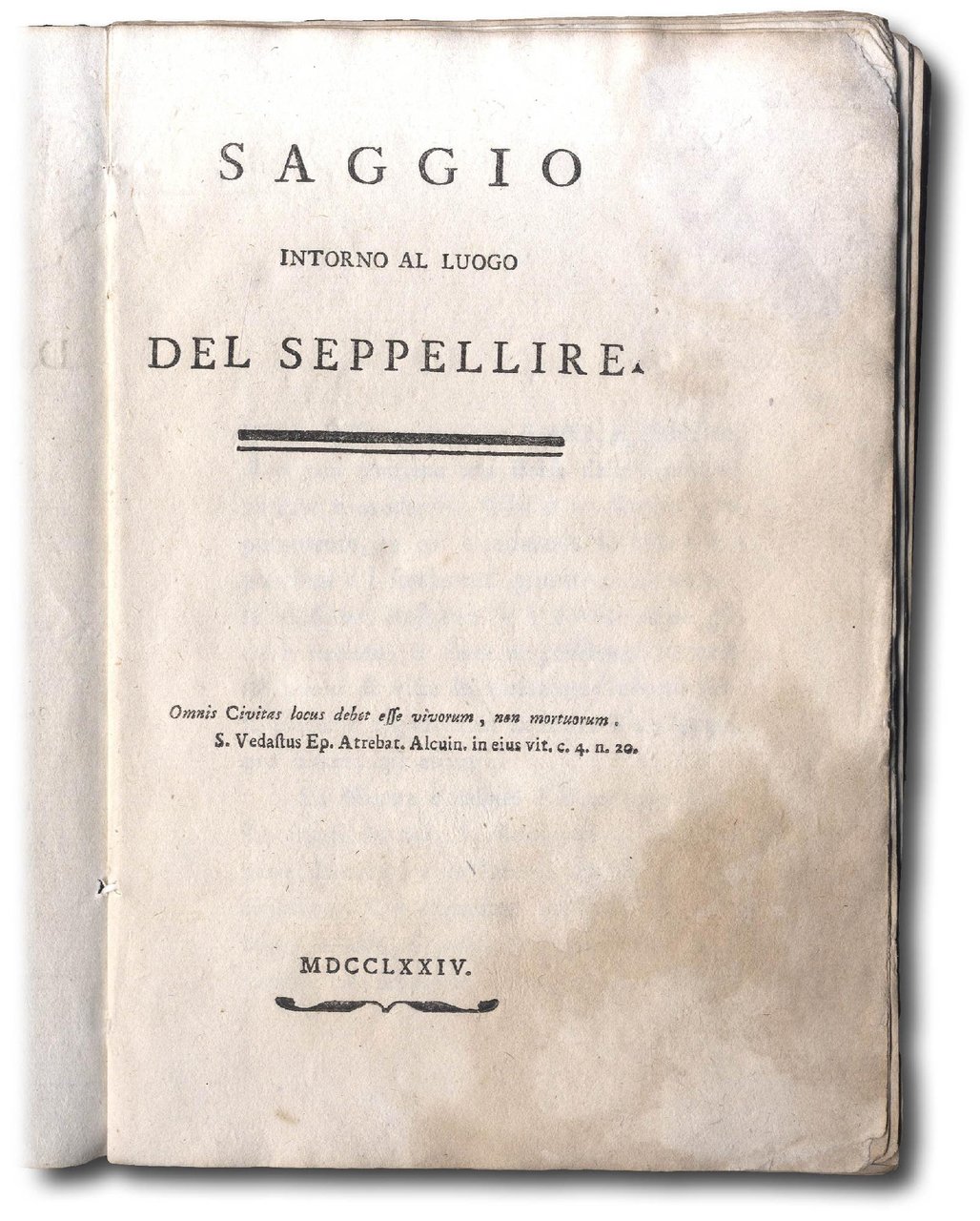 >in-8, pp. VII, (1; primo foglio bianco), 87, (1), legatura coeva in carta decorata. Questo testo apparso anonimo, ma opera del modenese Scipione Piattoli, ebbe molta fortuna a partire dalla data della sua prima pubblicazione nel 1772. Il volume tratta della questione dei cimiteri posti fuori dell'abitato frutto d'una riforma settecentesca di portata europea, che incontrò forti opposizioni perchè lesiva di pratiche religiose radicate nel vivere sociale; giunse infatti a compiuta realizzazione soltanto nel secolo seguente. Modena fu una delle prime città che tentarono lo spostamento fuori dall'abitato, nell'ambito di un assolutismo illuminato volto al miglioramento della salute pubblica. Opera letta da Foscolo che influenzò la stesura dei suoi "Sepolcri". Alcuni antichi restauri al primo foglio bianco, lievi gore nel margine inferiore bianco dei primi fogli. G. Tommasi, Per Salvare i viventi, Il Mulino 2002; Melzi, III, 13.