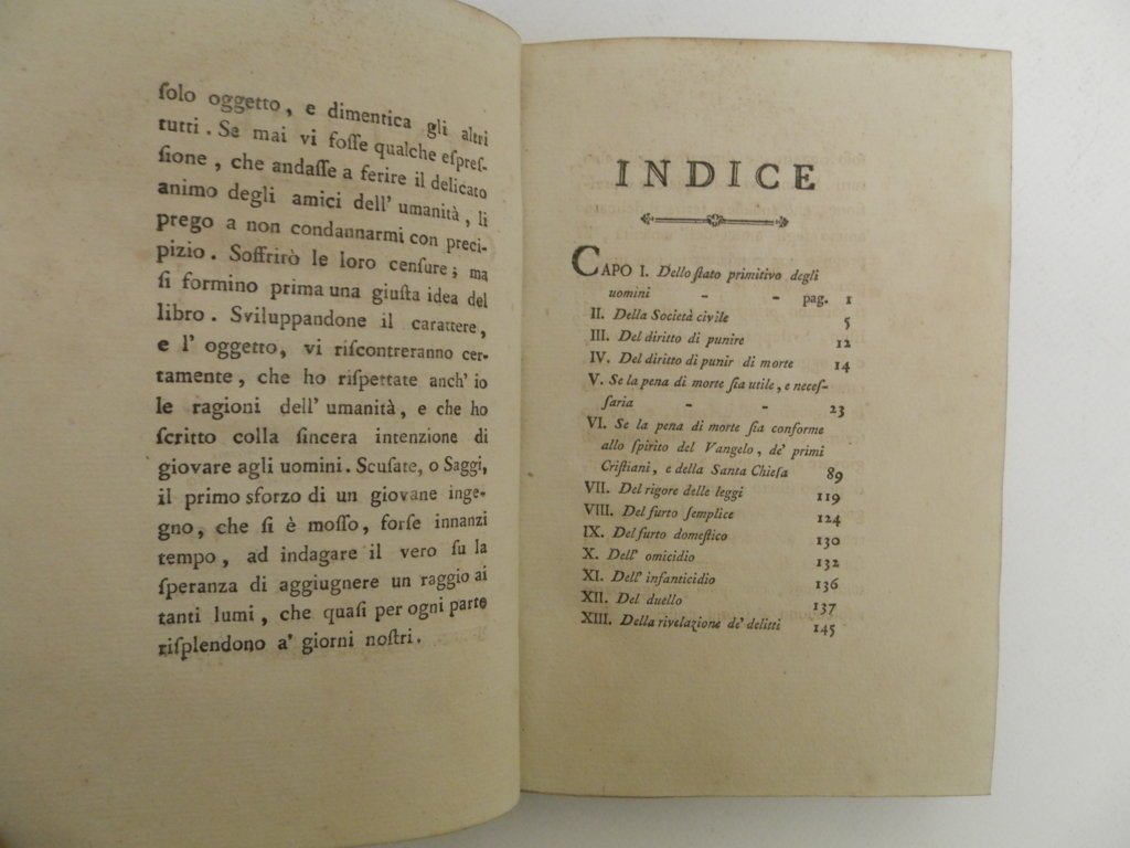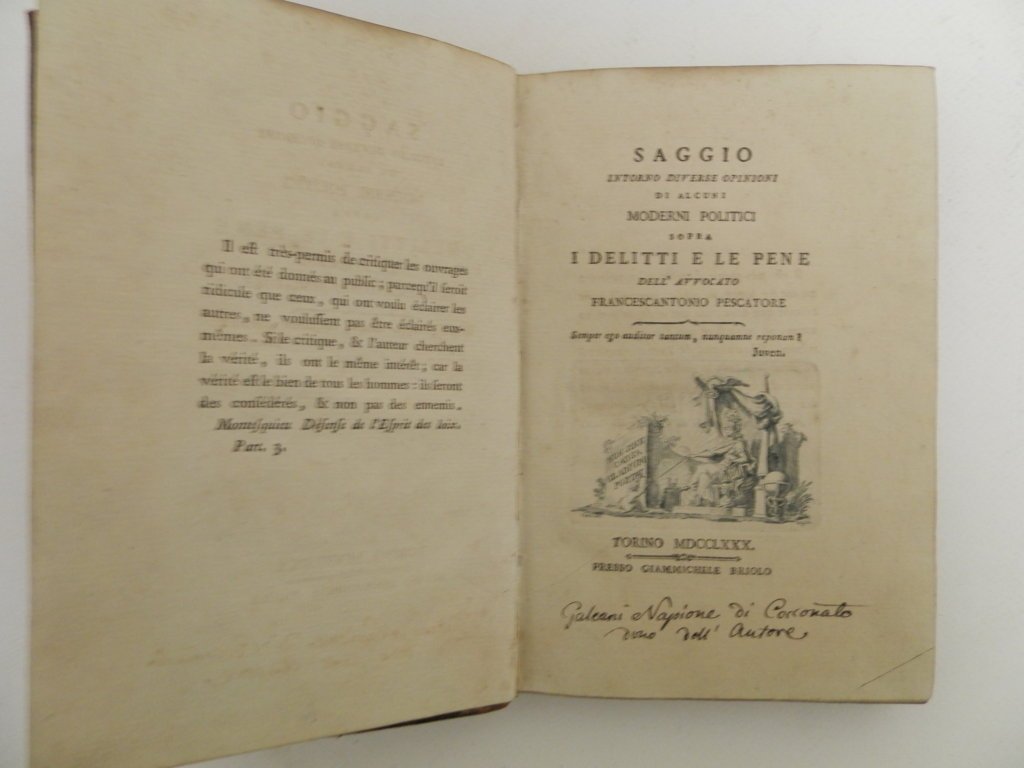 8°, mm 190x130, pp. (8), 226, (2), legatura coeva in piena pelle con doppia cornice dorata ai piatti e fregi al dorso a cinque nervi, tagli a spruzzo marmorizzati, bella vignetta al frontespizio disegnata da Visca e incisa da Gay con motto "Non sine causa gladium porta". Ottima conservazione delle carte interne, minimali e sporadiche macchioline: la doratura del dorso e dei piatti piuttosto sbiadita, consunta la legatura con qualche segno del tempo, ma nel complessa buona copia. Elegante edizione originale, l'unica pubblicata, stampata su carta forte azzurrina, arricchita dalla dedica dell'autore manoscritta al frontespizio a un importante personaggio torinese dell'epoca: "Galeani Napioni di Cocconato. Dono dell'autore". Si tratta dell'unico testo di carattere giuridico-penale pubblicato dall'autore Francescantonio Pescatore (Casale Monferrato 1751-Thonon 1792), letterato piemontese ch coprì anche cariche politiche fino a raggiungere il ruolo di intendente alle finanze. L'opera si inserisce nella disputa innescata dall'opera di Beccaria "Dei delitti e delle pene", pubblicata nel 1764. EXPORT LICENCE AVAILABLE. *** TUTTI I NOSTRI LIBRI SONO VISIBILI PREVIO CONTATTO MAIL O TELEFONO NELLA NUOVA SEDE DI MILANO: LIBRERIA COSMOPOLIS, VIA JOMMELLI, 22. ***