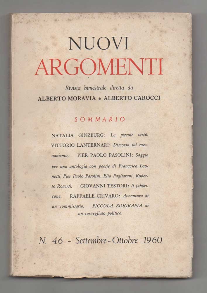 PERIODICOEdizione originale.Più che buon esemplare (piatti fioriti e normale brunitura alle carte). Timbro della sezione del PCI di Somma Lombarda alla prima carta.Numero 46 del settembre-ottobre 1960 di «Nuovi Argomenti» con il famoso studio di Pier Paolo Pasolini «Saggio per una antologia con poesie di Francesco Leonetti, Pier Paolo Pasolini, Elio Pagliarani, Roberto Roversi». Dopo una breve introduzione, sono appunto i versi più recenti del poeta di Casarsa insieme a quelli degli amici Leonetti e Roversi e di Pagliarani a essere qui raccolti. Nello stesso fascicolo, presenti inoltre «Le piccole virtù» di Natalia Ginzburg, «Discorso sul messianismo» di Vittorio Lanternari; «Il fabbricone» di Giovanni Testori e «Avventura di un commissario» di Raffaele Crivaro.