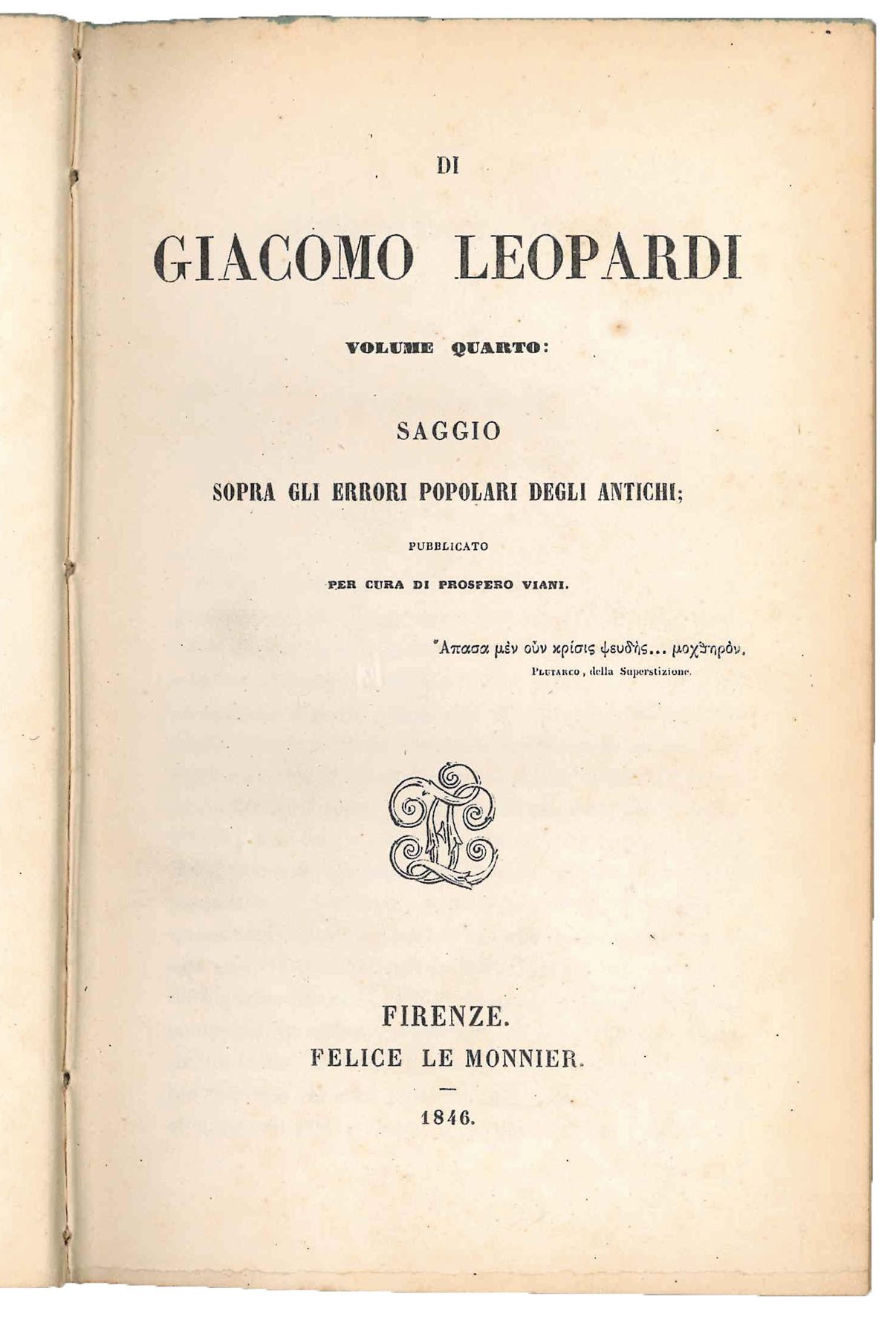 Prima edizione pubblicata postuma. Nella prefazione indirizzata dal curatore Prospero Viani a G.B. Niccolini si ricorda: “Questo Saggio scritto nel 1815 doveva stamparsi in Roma: l'anno dopo l'A. cercò di pubblicarlo altrove, e ne mandò una copia di netto carattere, corretta di mano propria in più luoghi, e di propria mano scrittevi le parole greche, ad Antonio Fortunato Stella di Milano; dove, come in Roma, non se ne mandò ad esecuzione il disegno […] Il Leopardi nel medesimo anno 1816, e più nel 1826 ne richiese, senza effetto, il manoscritto allo Stella per farne qualche uso, e nel 1830 lo credeva smarrito. Ma non andò smarrito; ed è questo che io nell'agosto di questo anno 1845 con varie sue lettere acquistai, ed ora divulgo con le stampe”. Il saggio riveste notevole importanza per la storia letteraria e filosofica leopardiana perché in questa opera giovanile (nel 1815 l'autore aveva solo 17 anni) già risuonano molti spunti e sentimenti che compariranno nei Canti e nelle Operette morali. L'indicazione al frontespizio “Volume quarto” si spiega con il fatto che il Saggio fu pubblicato nell'ambito della edizione delle Opere di Giacomo Leopardi stampate da Le Monnier.