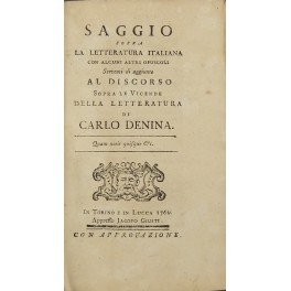 Saggio sopra la letteratura italiana, con alcuni altri opusculi serventi di aggiunte al Discorso sopra le vicende della letteratura. UNITO A: Denis Diderot - Il padre di famiglia commedia in cinque atti in prosa del celebre signor Diderot. Tradotta dal francese in italiano dal sig. Michele Bocchini. Livorno, per Gio. Paolo Fantechi, 1762, prima edizione