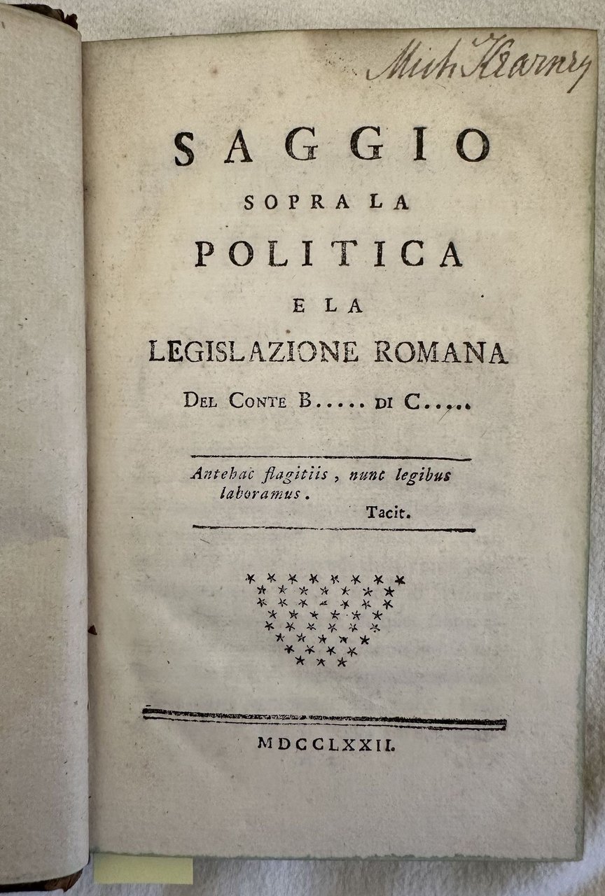 Rarissima prima edizione del 1772 di questa opera dell'illuminista canavesano Giacomo Botton di Castellamonte (Rivarolo Canavese 1754-Parigi 1828). L'opera venne pubblicata anonima e stampata probabilmente in Toscana (Livorno o Firenze) per non incorrere nei rigori della censura sabauda, ad un anno di distanza dalla laurea in giurisprudenza dell'Autore avvenuta in giovanissima eta'. "L'opera veniva a collocarsi sulle orme di quelle del Muratori, del Beccaria, del Verri e di C. A. Pilati nella polemica giusnaturalistica contro i diritti storici imperanti a favore di una codificazione che si fondasse sui principi del diritto naturale . originale soprattutto appariva la sua vigorosa condanna del testamento romano che, sotto la specie della sostituzione fidecommissaria, era stato l'istituto generatore della nobiltà ereditaria" (G. Vaccarino in D. B. I. 13/481). Antica firma al frontespizio. In buone condizioni. Copertina in piena pelle coeva con titolo e decorazioni in oro al dorso in mediocri condizioni generali con lievi usure ai margini e dorso. Piatto posteriore staccato. Legatura in buone condizioni. All'interno le pagine si presentano in ottime condizioni con rare fioriture. In 16. Dim. 18x11,5 cm. Pp. 286+(2). Peso Kg. 0,300.Very scarce first edition of 1772 of this work about the illuminist scholar Giacomo Botton di Castellamonte (Rivarolo Canavese 1754-Parigi 1828). The work was published anopnymous and published probably in Tuscany (Livorno or Firenze) to avoid Piedmont censorship after one year the author took a degree in very early age. "L'opera veniva a collocarsi sulle orme di quelle del Muratori, del Beccaria, del Verri e di C. A. Pilati nella polemica giusnaturalistica contro i diritti storici imperanti a favore di una codificazione che si fondasse sui principi del diritto naturale . originale soprattutto appariva la sua vigorosa condanna del testamento romano che, sotto la specie della sostituzione fidecommissaria, era stato l'istituto generatore della nobiltà ereditaria" (G. Vaccarino in D. B. I. 13/481). Antique signature in the title page. In good conditions. Full leather coeval cover with gilted title and decorations in the spine in poor general conditions lightly worn in the extremities. Back plate is detached. Binding in good conditions. Inside pages are in very good conditions with occasional foxing. In 16. Dim. 18x11,5 cm. Pp. 286+(2). Peso Kg. 0,300.<BR><BR>
