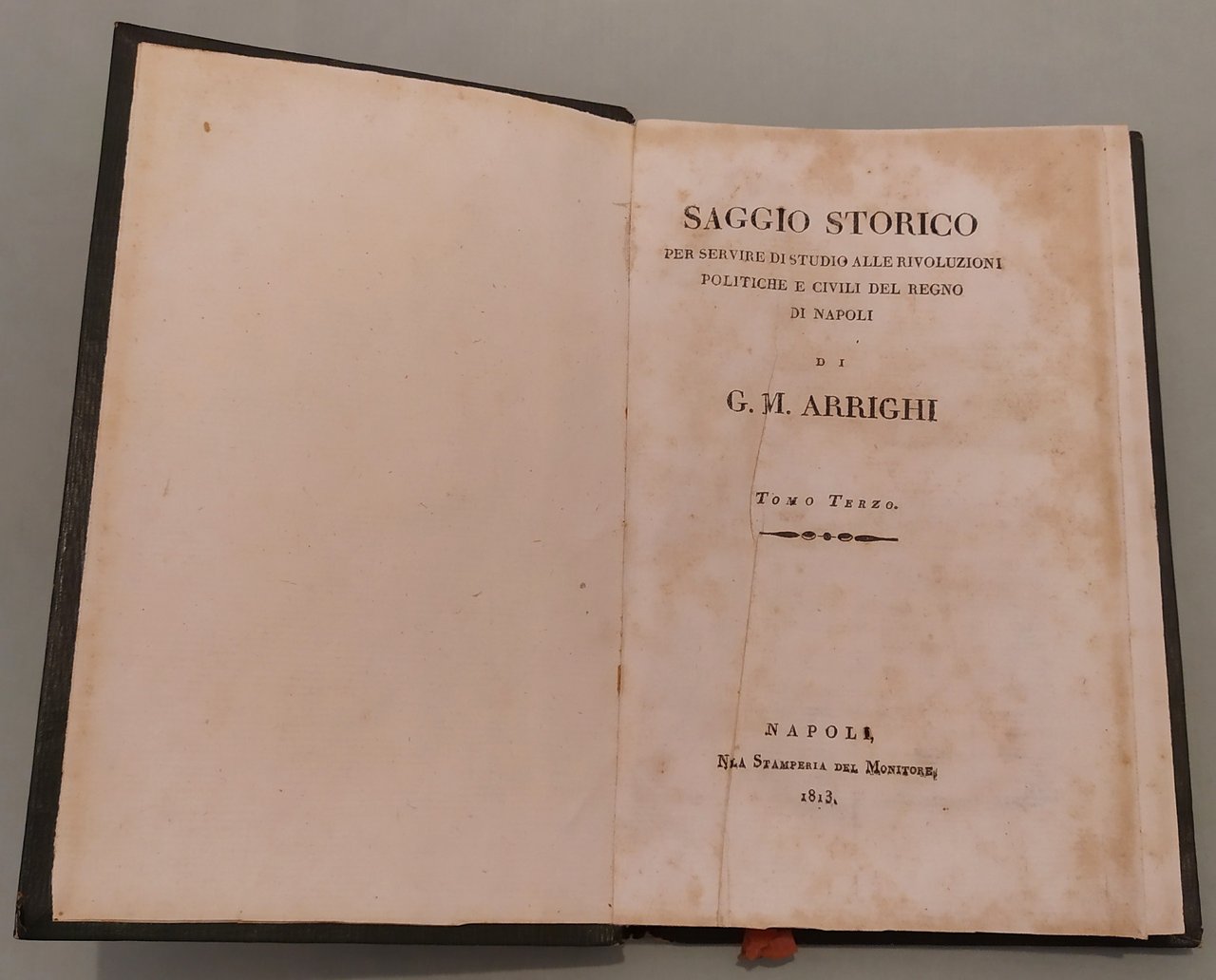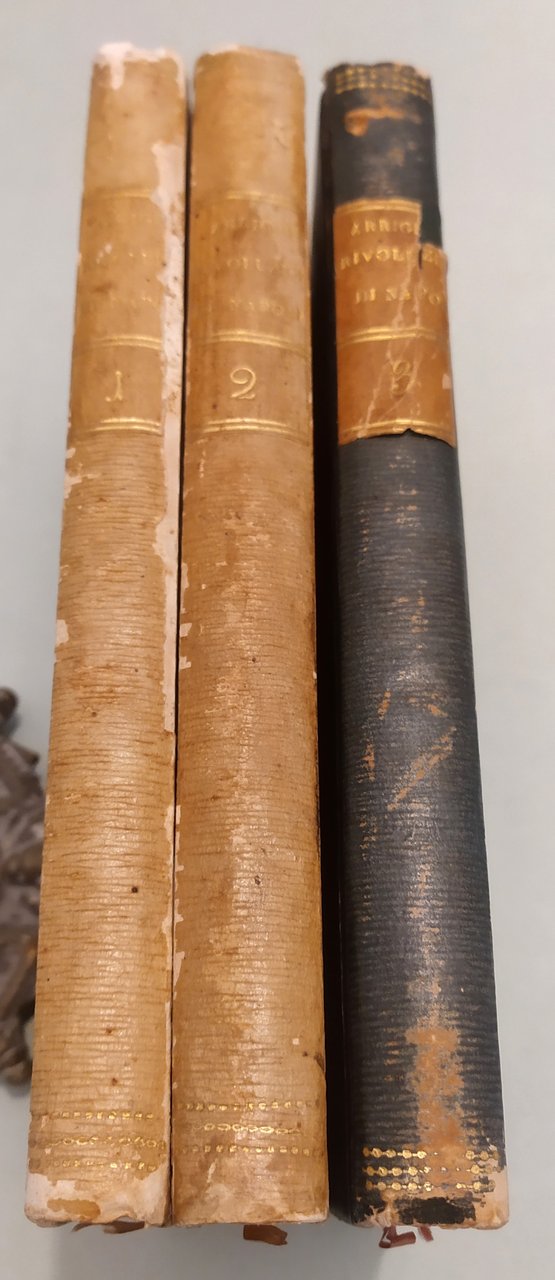 Napoli, nella Stamperia del Corriere, 1809-1813. (Al volume terzo: nella Stamperia del Monitore, 1813). Tre volumi in 8vo; pp.IV,211;234,1n.n. con errata;270. Cart. coevo, piatti inquadrati da fregio in oro, dorsi con titolo e fregi dorati. Il terzo volume in cart.coevo differente ma simile (vedi foto). Massafra, Patrioti ed Insorgenti in Provincia: il 1799 in Puglia e Basilicata, pag. 736 n.35. Raro.