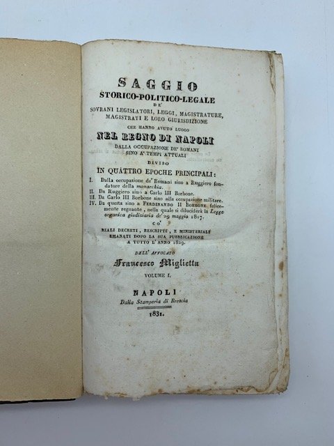 2 volumi legati in uno, in 8, cm 14,5 x 23, pp. 368; 232. Legatura moderna. Esemplare in barbe. Edizione originale e unica di questo raro studio dedicato ai sistemi giurisdizionali che vennero attuati sotto vari sistemi che governarono il Regno di Napoli a partire dai popoli preromani (Sabini, Equi, Volsci, Palmensi, Sanniti, Picentini ecc. ecc. ), Romani, Goti, Astrogoti, Normanni, Svevi, Angioini. L'opera avrebbe dovuto proseguire con la cronaca delle norme sino a al 1829, cioe' al Regno di Ferdinando II ma i volumi successivi non videro la luce. Dura 10138