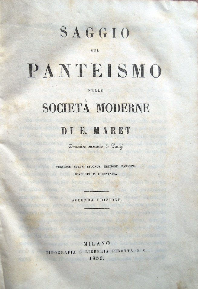 In-8° (21 x 14,6 cm), pp. 284, legatura coeva in mezza pelle con titoli in oro su tassello al dorso. Normali segni del tempo alla legatura. Una nota a matita nel margine esterno delle pagine 45 e 59, fioriture limitate alla parte superiore delle pp. 65-76. Al verso della guardia anteriore, vecchio ritaglio di catalogo librario, con i dati e una breve descrizione di due esemplari di due diverse edizioni dell'opera in questione, con indicazione di prezzo in lire. Per il resto esemplare ben conservato. Volume IX. nella "Biblioteca ecclesiastica. Classe seconda - Dogmatica, Polemica, Filosofia-Morale". Indice: Capitolo I. Della filosofia in Francia al secolo decimonono. Il razionalismo del secolo decimonono riducesi al panteismo; Capitolo II. Seguito dell'esame della filosofia nel secolo XIX. Il misticismo nel secolo XIX non è che panteismo; Capitolo III. Nessuna via di mezzo possibile tra il Cattolicismo ed il Panteismo; Capitolo IV. Storia del Panteismo; Capitolo V. Confutazione del Panteismo. Il Panteismo considerato in sé stesso; Capitolo VI. Seguito della confutazione. Il panteismo considerato nella sua applicazione agli sviluppi dell'umanità; Capitolo VII. Del Cattolicismo; Capitolo VIII. Nuove obbiezioni contro il Cattolicismo; Capitolo IX. Seguono le obbiezioni. Henri Maret, teologo francese (Meyrueis, Lozère, 1805 - Parigi 1884), insegnò dogmatica alla Sorbona (1841), di cui divenne decano nel 1853. Fondò con Lacordaire e Ozanam l'Ere nouvelle (1848), che difendeva l'accordo fra la democrazia e la Chiesa; fu poi sostenitore della politica dell'Impero, ponendosi a capo di un gruppo di teologi e di cattolici moderatamente gallicani. Alla sua morte era arcivescovo titolare di Lepanto e ausiliare di Parigi.