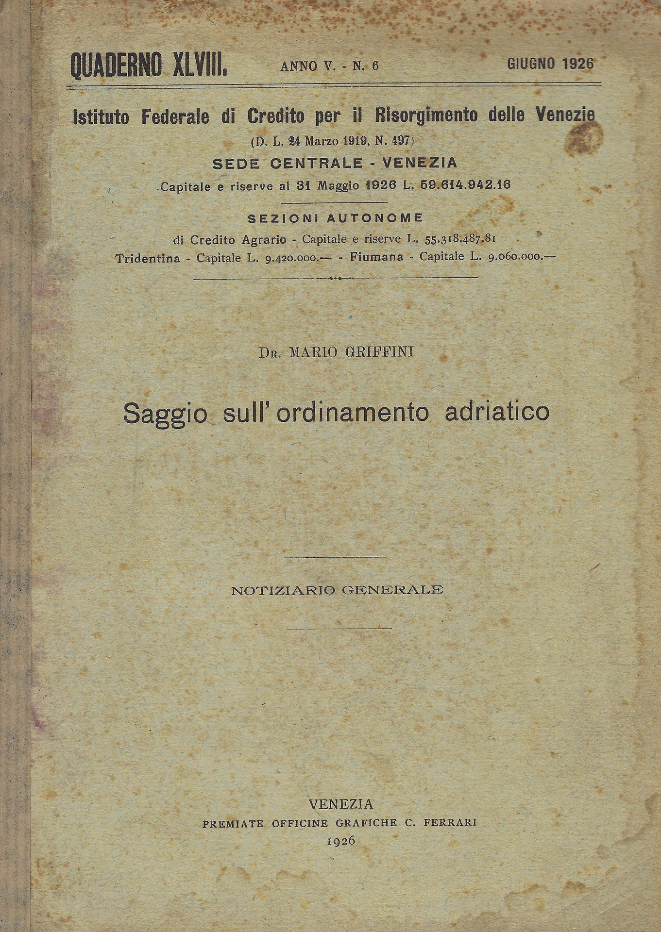 Officine grafiche C. Ferrari, 1926. Collana Quaderni, Istituto federale di credito per il risorgimento delle Venezie, 48- Quaderno XLVIII, anno V, n. 6. (Con 10 carte di tavole, di cui 5 ripiegate. Da pag. 1 a 65: Notiziario generale, 65 pp. copertina rigida Buono (Good) fioriture su copertina, re-indorsato e spillato, macchie d' umidità su prime pagine, restanti pagine in ottime condizioni.