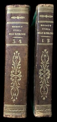 In 8°; 4 tomi in due volumi: VI, 205, (3) pp., 214, (2) pp., 328, (4) pp., (4), 332, (4) pp. Belle ed elegante legature coeve in mezza-pelle con titolo, autore, numero dei volumi e ricchissimi fregi in oro al dorso. Tagli spruzzati in azzurro. Qualche lieve strofinatura ai piatti. Esemplare in buone-ottime condizioni di conservazione. Prima edizione italiana di questa celeberrima storia della matematica, opera del celeberrimo gesuita, geometra e matematico gesuita, Charles Bossut (Tartaras, 11 agosto 1730 Parigi, 14 gennaio 1814). Bossut fu, insieme a Diderot e D'Alambert, uno dei compilatori dell'"LEncyclopédie ou Dictionnaire raisonné des sciences, des arts et des métiers", trattandone, in particolare, le voci matematiche. Nel 1768 fu eletto all'Accademia delle Scienze, oltre ad essere corrispondente delle Accademie di Berlino e Bologna e membro onorario dell'Accademia di San Pietroburgo a partire dal 1778. Dopo aver studiato al collegio gesuita della Trinità di Lione, si dedicò alla ricerca scientifica ed iniziò a collaborare con Diderot e d'Alembert all'Encyclopedie. Ottenne presto, attraverso le sue opere, la protezione di Alexis Claude Clairaut, Jean le Rond d'Alembert e Charles Etienne Louis Camus. Grazie a quest'ultimo ed alla di lui influenza, fu nominato professore alla Scuola Reale di Ingegneria di Mézières nel 1752. Durante il Terrore cadde in disgrazia ma sotto l'Impero, nel 1796, su iniziativa di Gaspard Monge, suo ex allievo a Mézières, divenne esaminatore per l'uscita degli studenti dell'École polytechnique, carica che tenne fino al fino al 1808. Fu anche ispettore generale delle macchine e dei lavori idraulici degli edifici del re e professore reale di idrodinamica. Il suo nome è particolarmente legato agli esperimenti da lui condotti, nei bacini dell'École Militaire, con Nicolas de Condorcet e Jean le Rond d'Alembert, per determinare la resistenza che l'acqua oppone al movimento delle navi (1775-1777). L'opera è una delle più apprezzate storia della matematica fino ad allora scritta e si avvale della traduzione e delle note del matematico, religioso e accademico milanese, Gregorio Fontana, nato Giovanni Battista Lorenzo Fontana (Nogaredo, 7 dicembre 1735 Milano, 24 agosto 1803), fratello del fisico Felice Fontana (17301805) e fu il successore di Ruggero Giuseppe Boscovich nella cattedra di matematica dell'Università degli Studi di Pavia, dove fu anche direttore della Biblioteca Universitaria. Il 16 aprile 1795 divenne membro della Royal Society. Prima edizione italiana, in buone-ottime condizioni di conservazione. Rif. Bibl.: Riccardi 476; ICCU IT\ICCU\UFIE\003749.