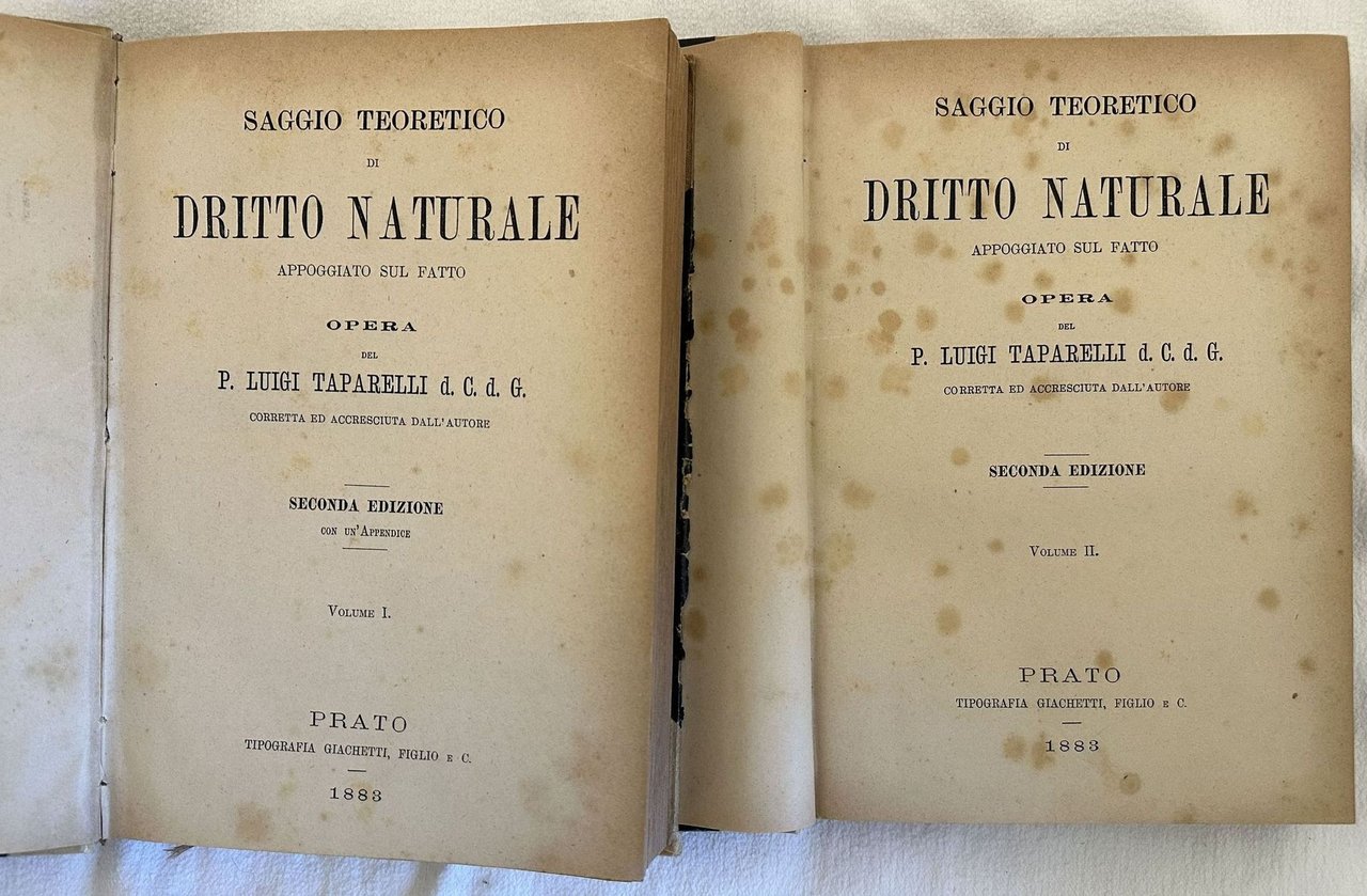 Edizione del 1883 di questa opera di diritto naturale scritta dal Padre gesuita, filosofo e sociologo Luigi Taparelli D'Azeglio (1793-1862) fratello del Senatore Massimo D'Azeglio. L'opera è composta da due volumi ed è completa. L'opera, pubblicata per la prima volta nel 1840-43 è una vera enciclopedia di morale, diritto e scienza politica ed è considerata la sua opera più importante. In buone condizioni. Copertina in mezza pergamena coeva con titolo e decorazioni in oro su tassello al dorso in buone condizioni generali con lievi usure ai margini e dorso. Legatura in buone condizioni. Pagine in buone condizioni con rare fioriture. In 8. cm 24,5x18. Pp. XII+514, 515. Edition of 183 of this work of natural right written by the jesuit phylosopher and sociologist Luigi Taparelli D'Azeglio (1793-1862) brother of Senatore Massimo D'Azeglio. The work is made up of two volumes and it is complete. The work, published for the first time in 1840-43 is a real aencyclopedia of morality, right and political science and is considered his most important work. In good conditions. Half leather coeval cover with spine title and decorations in good conditions lightly worn in the extremities. Binding in good conditions. Pages in good conditions with occasional foxing. In 8. cm 24,5x18. Pp. XII+514, 515<BR><BR>