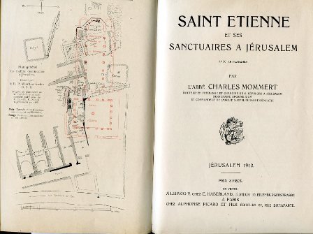 In-8°, pp. VIII, (2), 308, legatura del tempo m. pelle nera e angoli con titolo e decori ondulati in oro al dorso. Piatti marmorizzati. Una tavola all'antiporta in rosso e in nero con pianta generale degli scavi compiuti dai domenicani a Gerusalemme e altre 11 tavv. in fine con planimetrie. L'ultima tavola, fotografica, raffigura le rovine del Santuario di Santo Stefano. Ottimo esemplare. Prima edizione, poco comune, di questo rilevante studio storico-archeologico sulla figura del protomartire Santo Stefano, sul luogo della sua lapidazione a Gerusalemme, sulle reliquie del Santo, sul Santuario che venne eretto in suo onore e sugli scavi a esso inerenti. Le presunte reliquie di Santo Stefano vennero trasportate a Gerusalemme nel 460 (il rinvenimento della sua tomba era avvenuto nel 415 a Caphar Gamala) e riposte nella basilica fatta erigere dall'imperatrice Eudocia in un sobborgo a nord della città, dove sarebbe avvenuta la lapidazione. Il Mommert, sacerdote dell'ordine domenicano, fu canonico del Santo Sepolcro a Gerusalemme e autore di importanti scavi archeologici nella città santa. Nel presente libro egli si riallacciò alle molte polemiche intorno all'autenticità del Santuario, innescate dal libro del padre Lagrange del 1894 su 'Saint Etienne et son sanctuaire à Jérusalem'.