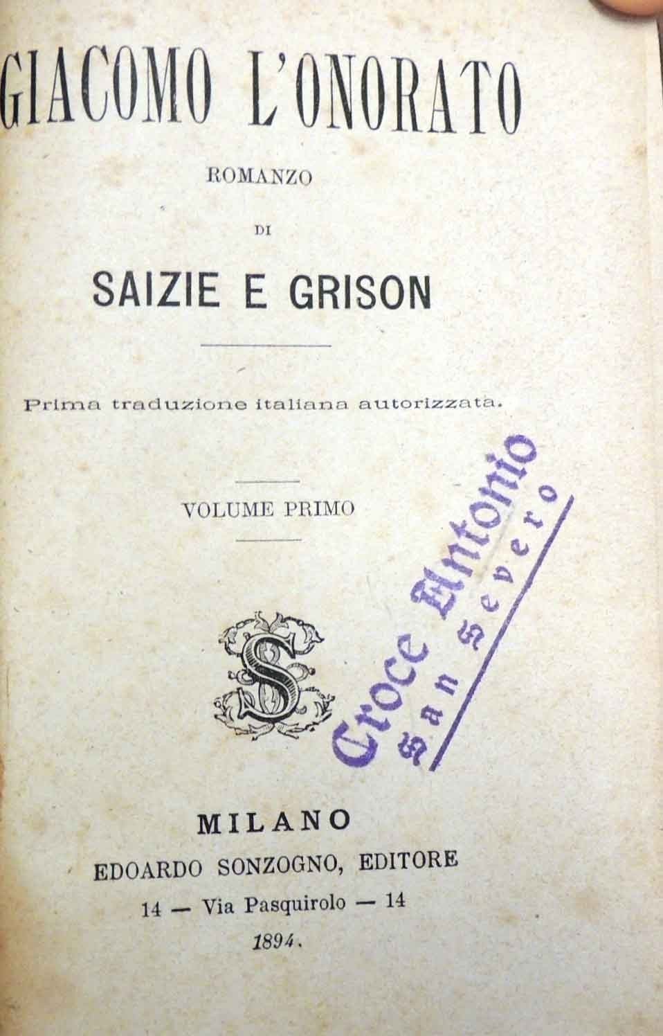 Giacomo l’onorato. Romanzo di Léon Saize (Saizie) e Georges Grison, prima traduzione italiana autorizzata, Edoardo Sonzogno Editore, Milano 1894, 2 voll. legati in uno, pp. 403, cm 16, legatura in mezza tela muta. Volume primo: pp. 192. Volume secondo: pp. 211. Timbro di appartenenza al frontespizio del primo volume. Un segnetto di biro al taglio inferiore, minime fioriture, per il resto ben conservato. Raro.