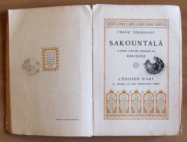Collection "Ex Oriente Lux". 1 tavola a colori f.t. di A. Touchet e fregi monocromatici in cornice a tutte le pagine. Edition d'Art Piazza - Paris, 1922. Brossura editoriale con minime tracce d'uso al dorso. Timbro del tempo al frontespizio. 11x15,5; pp.173. Ottimo stato. ,