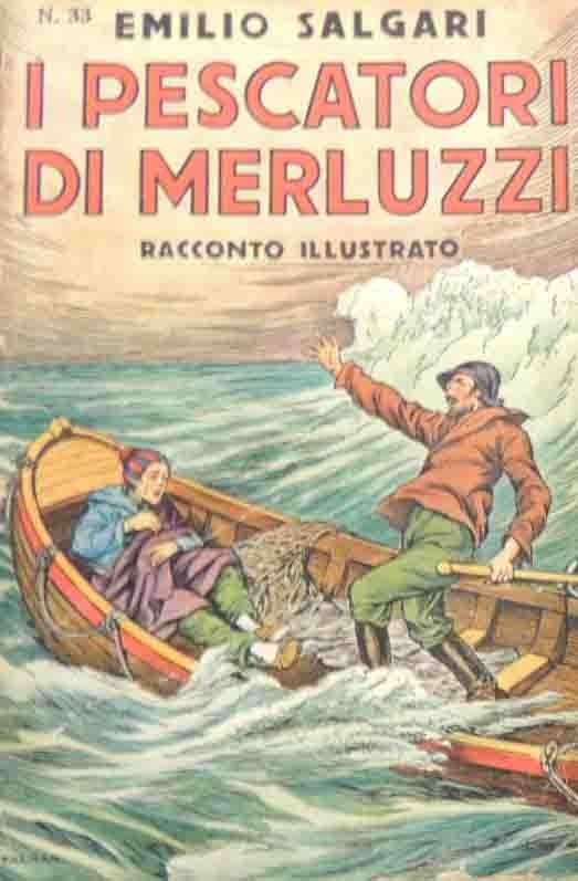 Emilio Salgari, I pescatori di merluzzi, Casa Editrice Sonzogno, Milano 1940, rist., pp. 32, ill. b.n., cm 18, pubblicazione spillata. Collana I racconti di avventure di Emilio Salgari, n. 33. Firma d’appartenenza al frontespizio, tracce d’uso, bruniture, sporadiche fioriture, ma comunque buona copia. Raro.