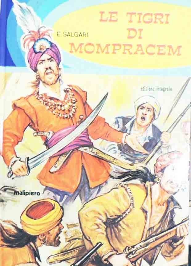 Emilio Salgari, Le tigri di Mompracem, edizione integrale, Malipiero spa Editore, Ozzano Emilia (Bologna) 1974, pp. 120, 4 c. di tavv. f.t. ill. col., cm 25, cart. ed. con titoli e illustrazioni al dorso e ai piatti. Collana I talenti, n. 64. Illustrazioni di L. Pellegrino. Minime tracce d’uso, lievi bruniture e fioriture, per il resto ben conservato.