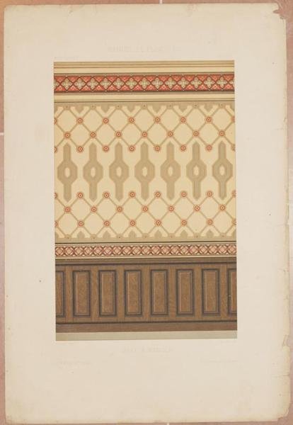 Bella cromolitografia del 1866 circa tratta dal "Journal manuel de peintures appliques a la decoration" diretto da Pierre Chabat per la decorazione di interni. L'incisione mostra la decorazione di una sala da pranzo. In buone condizioni. TECNICA: Cromolitografia AUTORE: Massot DIMENSIONI FOGLIO: cm 46,5x31,5 DIMENSIONI INCISIONE: cm 31x20,5 EPOCA: 1866 circa CONDIZIONI: Buone condizioni, qualche fioritura.Beautiful chromolythography of 1866 circa taken from the "Journal manuel de peintures appliques a la decoration" directed by Pierre Chabat for internal decoration. The planche shows the decoration of a dining room. In good conditions.TECHNIQUE: Chromolytography AUTHOR: Lefevre PAGE SIZE: cm 46x31,5 PRINT'S SIZE: cm 31x20,5 PERIOD: 1866 circa CONDITION: good conditions with some foxings