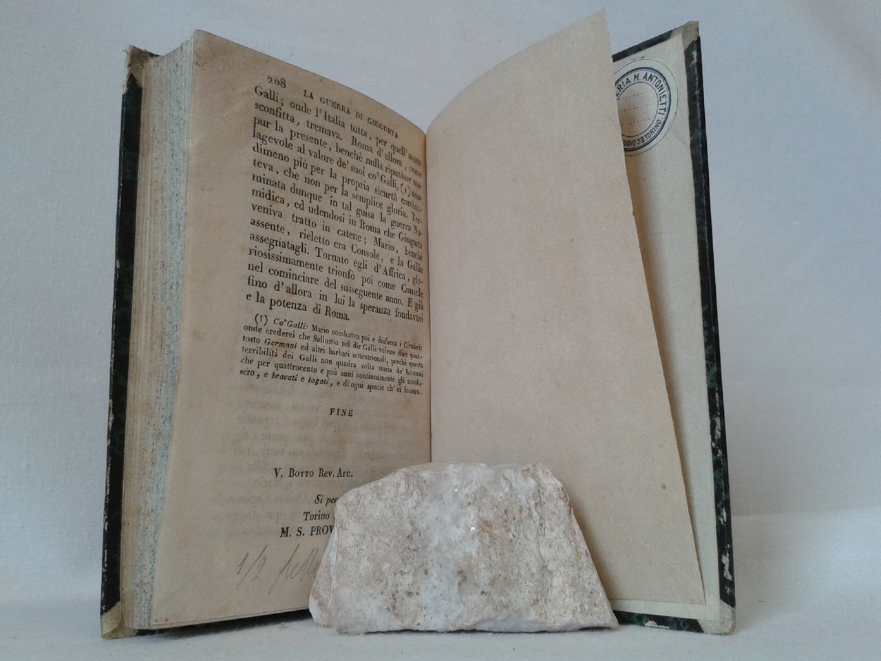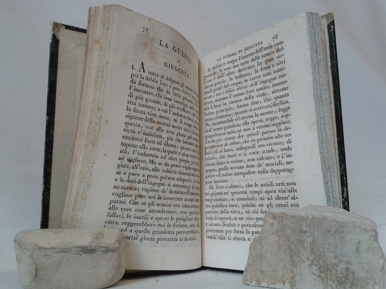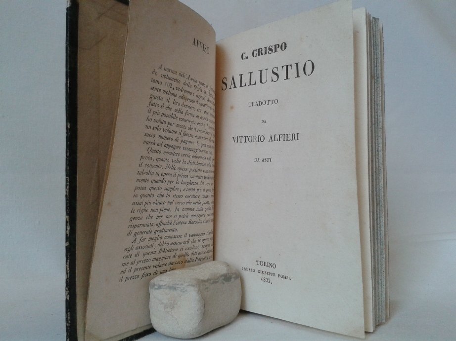 Volume in 16 (con registro in 8), legatura coeva in mezza pelle, titolo inciso al dorso ornato da fregi in oro, taglio spruzzato dazzurro, sguardie, carta davvertenza, frontespizio, prefazione delleditore e del traduttore, 208 pp. L'opera del Sallustio nella precisa traduzione dellAlfieri, in edizione breve, senza note e glosse, ma molto curata nella stampa e nel carattere dallottimo tipografo torinese. Lievi fioriture sparse dovute al tipo di carta. In pi che bello stato.