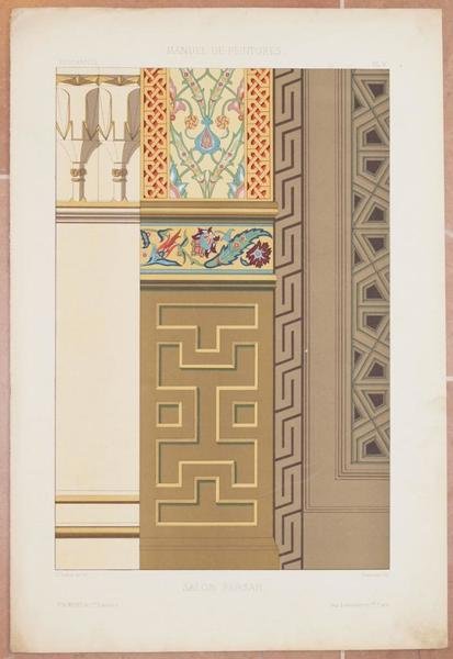 Bella cromolitografia del 1866 circa tratta dal "Journal manuel de peintures appliques a la decoration" diretto da Pierre Chabat per la decorazione di interni. L'incisione mostra un salone con decorazioni persiane In buone condizioni. TECNICA: Cromolitografia AUTORE: Daumont DIMENSIONI FOGLIO: cm 46x31,5 DIMENSIONI INCISIONE: cm 36x24 EPOCA: 1866 circa CONDIZIONI: Buone condizioni, qualche fioritura e strappo marginale. Beautiful chromolythography of 1866 circa taken from the "Journal manuel de peintures appliques a la decoration" directed by Pierre Chabat for internal decoration. The planche shows a persian salon. In good conditions. TECHNIQUE: Chromolytography AUTHOR: Massot PAGE SIZE: cm 46x31,5 PRINT'S SIZE: cm 36x24 PERIOD: 1866 circa CONDITION: good conditions with some foxings and tears in the edges<BR>
