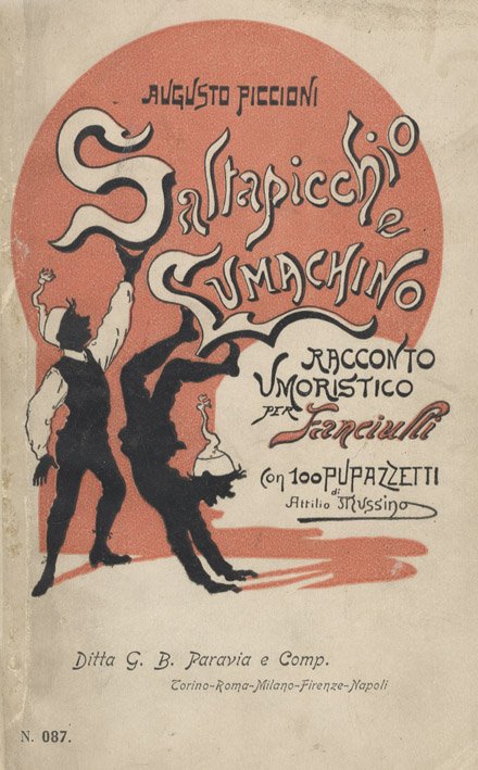 >in-16, pp. (6), 169, (2), leg. d'amatore m. pelle, tit. oro la dorso a nervi broch. edit. fig. cons. Edizione originale di questo racconto umoristico per fanciulli con 100 pupazzetti di Attilio Mussino. Tibaldi Chiesa, Letteratura infantile, p. 157.