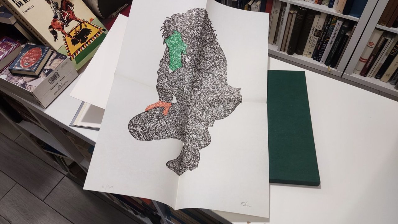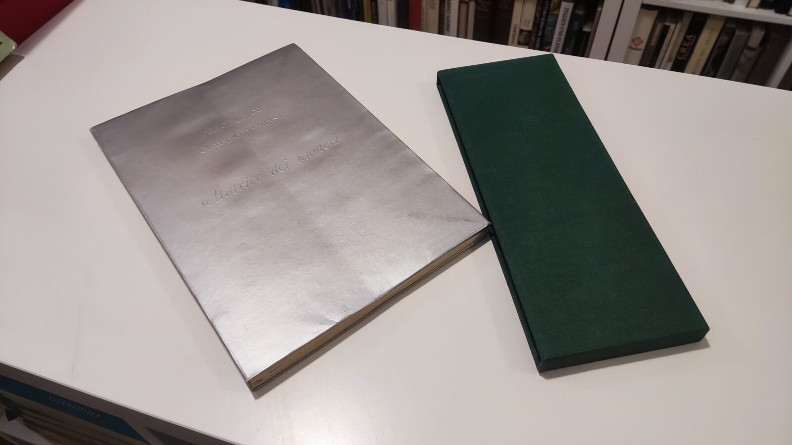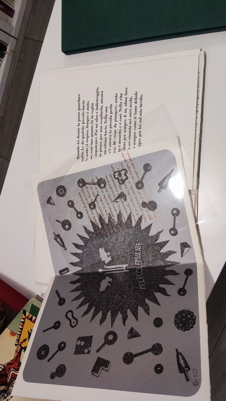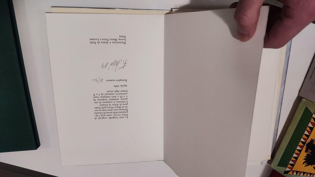 Felice Levini, Claudio Damiani Saltatrice dei numeri Illustrazione 3 esemplare 6/50 in fogli sciolti Prezioso libro d'artista curato da Illustrazione (Paola Invrea, Marco Noire, Luciano Pistoi). Contiene 7 litografie numerate e firmate da Felice Levini e alcune poesie di Claudio Damiani. Tirati in soli 50 esemplari sono oggi dei pezzi quasi unici. Libro in ottime condizioni, minimi segni del tempo: piccola piega a un acetato con impressione di una poesia. Non esitate a contattarci per altre foto o richieste. Saremo lieti di soddisfare ogni vostra esigenza.