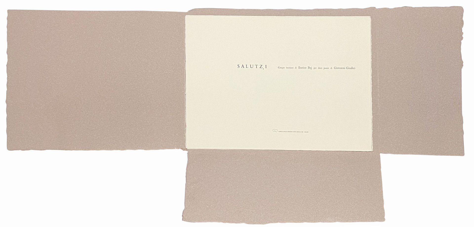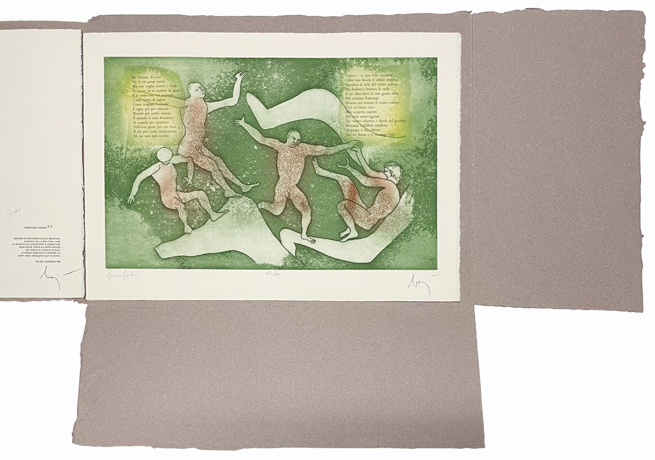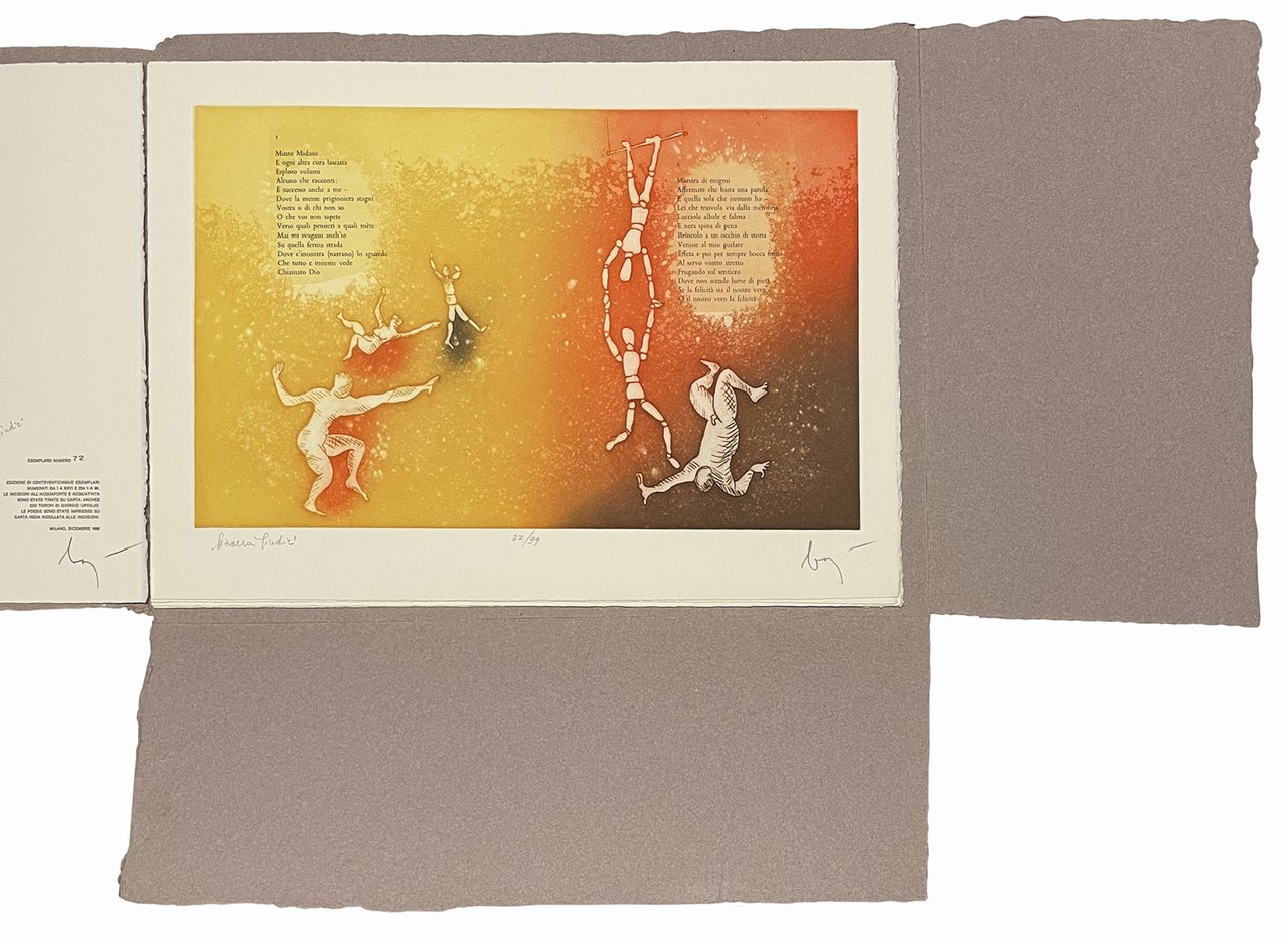 Mm. 455x317. 6 fogli sciolti in cartelletta editoriale in carta forte. Con 10 poesie originali stampate su carta India e incollate su 5 acqueforti acquetinte a colori di Enrico Baj. Una nota di Giovanni Giudici stampata su carta Arches. Edizione in tiratura limitata di 99 copie più XXVI, esemplari numerati e firmati dagli autori a matita a ogni foglio (ns copia nr. 22). Ottima copia di questo volume “piuttosto raro e molto ricercato”.