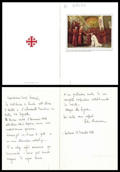biglietto manoscritto e firmato di Salvatore Arena del Sovrano Militare Ordine di Malta di due facciate datato Milano, 12 Dicembre 1978; buon es.