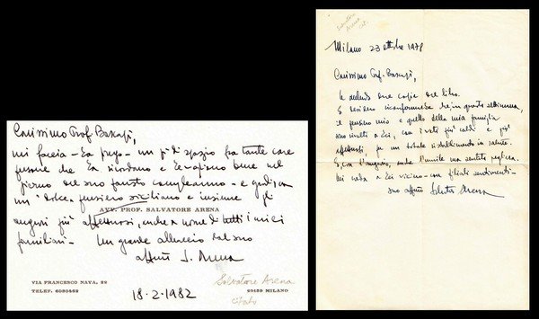 1 lettera e 3 biglietti manoscritti e firmati di Salvatore Arena; le lettere è datata Milano, 23 ottobre 1978, i biglietti, 21 ottobre 1981, 18 febbraio 1982, 3 agosto 1983; buoni ess.