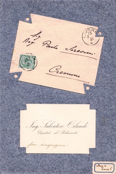 Salvatore Orlando. (Genova, 1856 – Livorno, 1926). ingegnere e politico italiano, Progettò i famosi MAS. Biglietto da visita completo di busta.