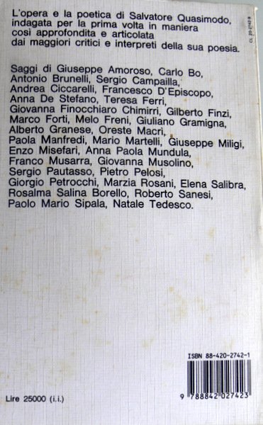 Soggetti: Poesia italiana, Classici, Novecento, Critica letteraria, Saggi critici, Raccolte poetiche, Poeti Italiani, Letteratura moderna e contemporanea, Italia, Poetica, Saggi Letterari, Studi culturali, Antologie, Seminari, Convegni, Ermetismo, Simbolismo, Ed è subito sera, Solaria, Poesie, Libri Vintage Fuori catalogo, Collezionismo, Lettere, Epistolario, Biografie, Carteggio, Cultura, Metrica, Figure retoriche, Proceeding, Opere generali, Influenze culturali, Eugenio Montale, Traduzioni, Classicismo, Lirica greca, Lirici greci, Sicilia, Pablo Neruda, Messinese, Curzio Malaparte, Gabriele D'Annunzio, Orfismo, Sogni, Linguaggio, Scrittura, Estetica, Eleusi, Esistenzialismo, Kafka, Proust, Politica, Guerre, Capolavori poetici, Tematiche, Vita privata, Italian poetry, Classics, Twentieth century, Literary criticism, Critical essays, Poetic collections, Italian poets, Modern and contemporary literature, Italy, Poetics, Literary essays, Cultural studies, Anthologies, Seminars, Conferences, Hermeticism, Symbolism, And it's immediately evening, Solaria, Poems, Books Out of Print, Collectibles, Letters, Letters, Biographies, Correspondence, Culture, Metrics, Rhetorical Figures, Proceeding, General Works, Cultural Influences, Translations, Classicism, Greek Lyrics, Sicily, Orphism, Dreams, Language, Writing, Aesthetics, Eleusis, Existentialism, Politics, Wars, Poetic masterpieces, Themes, Private life