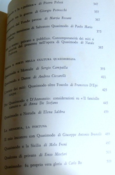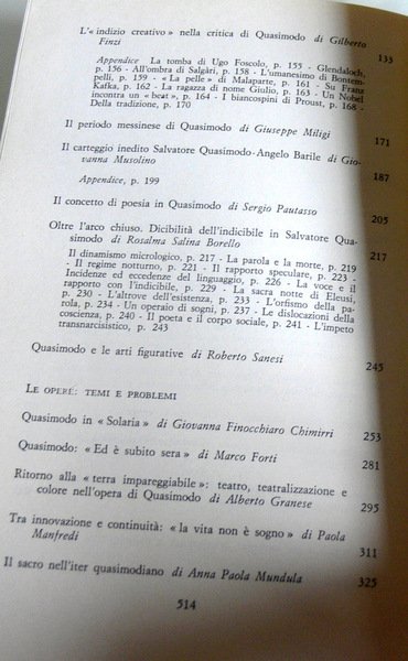 Saggi di: Giuseppe Amoroso, Carlo Bo, Antonio Brunelli, Sergio Campailla, Andrea Ciccarelli, Francesco D'Episcopo, Anna De Stefano, Teresa Ferri, Giovanna Finocchiaro Chimirri, Gilberto Finzi, Marco Forti, Melo Freni, Giuliano Gramigna, Alberto Granese, Oreste Macri, Paola Manfredi, Mario Martelli, Giuseppe Miligi, Enzo Misefari, Anna Paola Mundula, Franco Musarra, Giovanna Musolino, Sergio Pautasso, Pietro Pelosi, Giorgio Petrocchi, Marzia Rosani, Elena Salibra, Rosalma Salina Borello, Roberto Sanesi, Paolo Mario Sipala, Natale Tedesco.