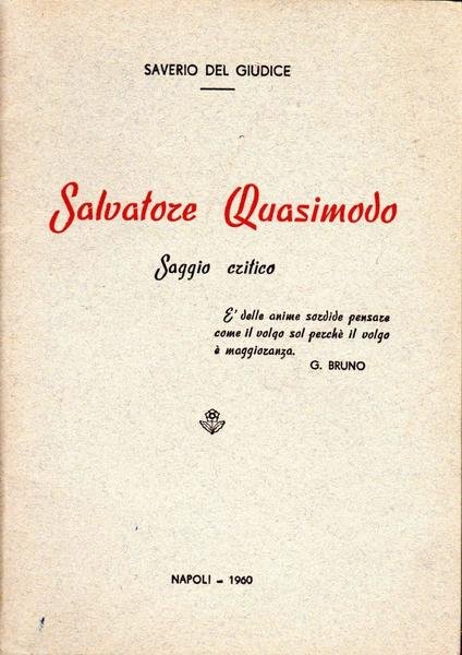 Salvatore Quasimodo. Saggio critico, prima edizione agosto 1960, pp. 45, formato 12 x 17.<BR>Copertina morbida di colore grigio con titoli in nero e rosso al piatto anteriore.<BR>Ottime condizioni.