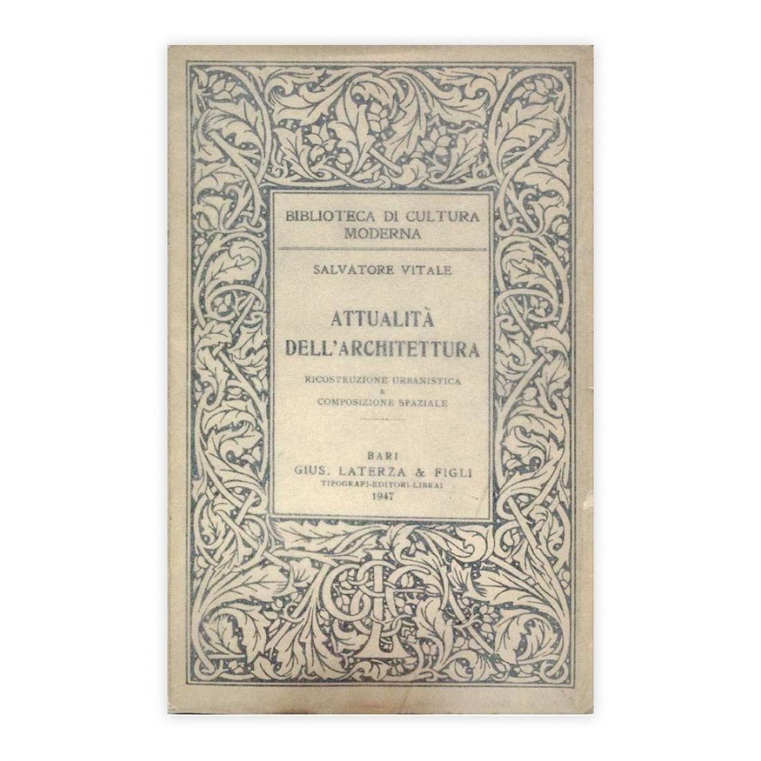 Autore: Salvatore Vitale Titolo: Attualità dell'Architettura Sottotitolo: Ricostruzione Urbanistica e composizione spaziale Edizione: Bari 1947 - Gius. Laterza & Figli Dimensioni: 13 x 20,5 cm c.a. Pagine: 177 Copertina: Brossura Condizioni: Ottime come da foto