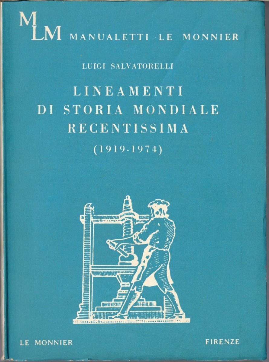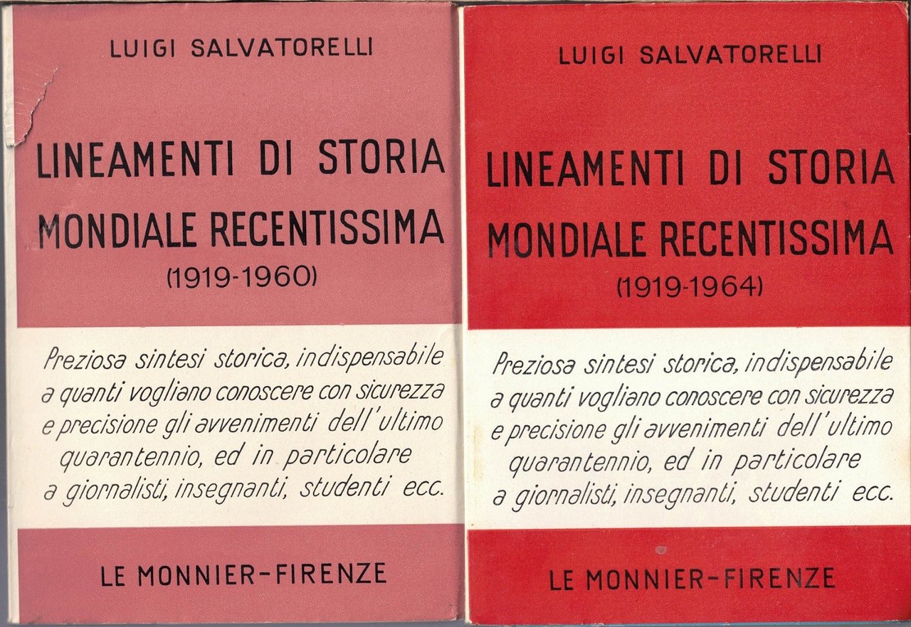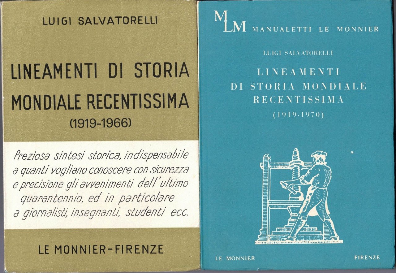 Luigi Salvatorelli, Lineamenti di storia recentissima. 1919-1955, Felice Le Monnier, Firenze 1955, terza ed. riveduta e aggiornata, pp. VI, 99, cm 17, br. ed. con sovraccoperta. In lotto con: Luigi Salvatorelli, Lineamenti di storia mondiale recentissima. 1919-1958, Felice Le Monnier, Firenze 1958, quarta ed. interamente riveduta e aggiornata, pp. 106, cm 17, br. ed. con sovraccoperta. In lotto con: Luigi Salvatorelli, Lineamenti di storia mondiale recentissima. 1919-1960, Felice Le Monnier, Firenze 1960, quinta ed. interamente riveduta e aggiornata, pp. 118, cm 17, br. ed. con sovraccoperta. In lotto con: Luigi Salvatorelli, Lineamenti di storia recentissima. 1919-1964, Felice Le Monnier, Firenze 1965, settima ed. interamente riveduta e corretta, pp. 131, cm 17, br. ed. con sovraccoperta. In lotto con: Luigi Salvatorelli, Lineamenti di storia mondiale recentissima. 1919-1966, Felice Le Monnier, Firenze 1968, ottava ed. interamente riveduta e aggiornata, prima rist., pp. 138, cm 17, br. ed. con sovraccoperta. In lotto con: Lineamenti di storia mondiale recentissima. 1919-1970, Felice Le Monnier, Firenze 1971, nona ed. aggiornata, prima rist., pp. 141, cm 17, br. ed. In lotto con: Luigi Salvatorelli, Lineamenti di storia mondiale recentissima. 1919-1974, pp. Felice Le Monnier, Firenze 1974, decima ed. aggiornata, pp. 146, cm 17, br. ed. Il lotto comprende sette differenti edizioni (terza, quarta, quinta, settima, ottava, nona e decima) dei Lineamenti di storia mondiale recentissima, di Luigi Salvatorelli, comprendenti complessivamente il periodo 1919-1974. Ogni volume costituisce l’aggiornamento del precedente. Timbro omaggio alla quarta di copertina di uno dei volumi e al frontespizio di altri due volumi. Uno strappetto senza mancanze alla sovraccoperta di uno dei volumi, minimi segni del tempo, per il resto esemplari molto ben conservati.