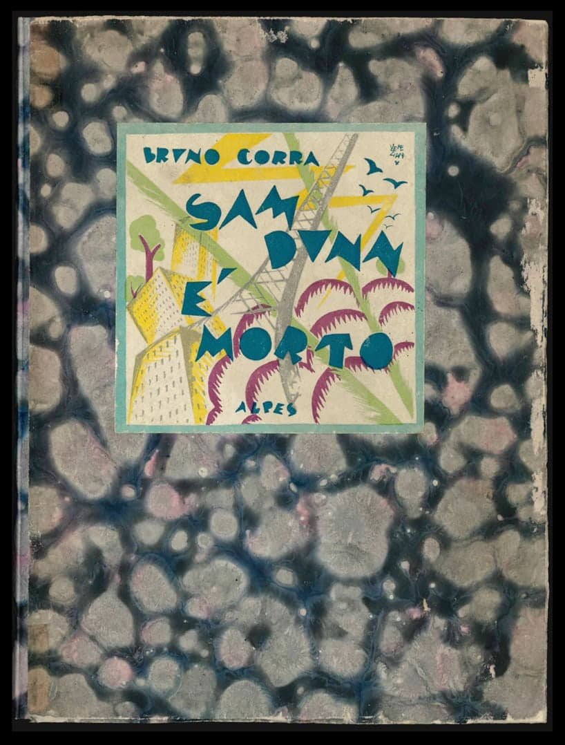 - brossura con sovracoperta in carta colorata a mano con effetto marmorizzato risvoltata a tamburo; applicato al piatto anteriore riquadro con titolo disegnato in stile déco futurista da Ubaldo Cosimo Veneziani;