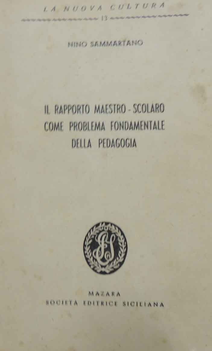 Nino Sammartano, Il rapporto maestro-scolaro come problema fondamentale della pedagogia, Società Editrice Siciliana, Mazara del Vallo 1953, pp. 149, cm 22, br. ed. Collana La nuova cultura, n. 13. Firma d’appartenenza alla prima pagina bianca. Tracce d’uso, qualche strappetto al dorso, minime fioriture, lieve brunitura della carta, alcune sottolineature e annotazioni a lapis e pastello, ma nel complesso esemplare in condizioni ancora accettabili e perfettamente fruibile. Raro.