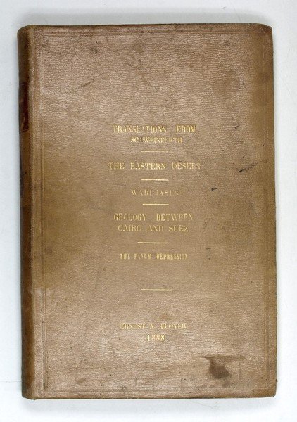 I: Titel und 101 beschriebene auf 103 num. SS. II: Titel und 34 beschr. auf 34 num. SS. III: Titel und 28 beschriebene auf 30 num. SS. IV: 114 einspaltig beschr. SS. auf 114 num. SS. V. 32 SS. I-IV: Folio. V: Gr.-8vo. Lederband der Zeit mit goldgepr. Deckel- und Rückentitel. Folio. Sammelband mit drei unveröffentlichten englischen Übersetzungen von Schriften Georg Schweinfurths, einer Übersetzung von Ernst Beyrich und einem Separatum von F. Cope Whitehouse. Aus dem Besitz von Ernest Ayscoghe Floyer (1852-1903), dem Direktor des Ägyptischen Telegraphenbüros in Kairo, mit dessen montiertem Exlibris am vorderen Innendeckel. In dem beigebundenen eh. Brief mit U. von Georg Schweinfurth (dat Kairo, 19. III. 1888; 1 S. auf Doppelblatt) berichtet Schweinfurth Floyer von einer italienischen Übersetzung seiner Arbeiten; zwei der hier vorliegenden Übersetzungen (I und II) stammen von Schweinfurth selbst, wenngleich in deren Titel nur vermerkt ist "translated for Mr. Floyer", eine Übersetzung (hier im Manuskript vorliegend) stammt von A. Dagefoerde, ein Manuskript (im Matrizenabzug) ist von Schweinfurth an einigen Stellen annotiert, einmal auch mit einer kleinen Handskizze versehen. - I. Georg Schweinfurth: The Unknown Land of Egypt. Ms. Typoskript. O. D. Mit zwei zwischengebundenen Holzschnitten nach Georg Schweinfurth, einer unsignierten Bleistiftzeichnung, zwei lithographierten Karten, einem Matrizenabzug und einem eh. Brief mit U. von Georg Schweinfurth. - II: Ders.: Ancient Remains of Buildings and Hieroglyphical Inscriptions in the Wadi Gasus. Ms. Typoskript. 1885 und 1888 (Übers.). Mit zwei zwischengebundenen hs. Illustrationen und einer mehrf. gef. Tafel. - III: E. Beyrich: On Geognostical Observations. Übers. von A. Dagefoerde. Hs. Manuskript. 1882 und 1888 (Übers.). Mit zwei lithogr. Karten. - IV: Georg Schweinfurth: Journey in the Depression of the Fayum January 1886. Letter To Paul Ascherson. Einspaltiger Matrizenabzug mit kleinen eh. Annotationen. 1886. A. d. Zeitschrift der Gesellschaft für Erdkunde zu Berlin. 1886. Nr. 2. Mit 1 lith. Karte. - V: F. Cope Whitehouse: Lake Morris: From Recent Explorations in The Moers Basin and the Wadi Fadhi. Separatum a. d. Journal of the American Geographical Society. Vol. XIV. O. D. Mit 1 lithogr. Karte.