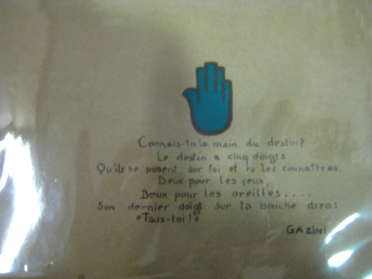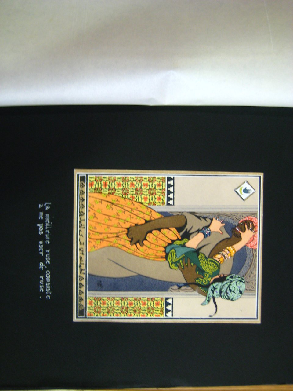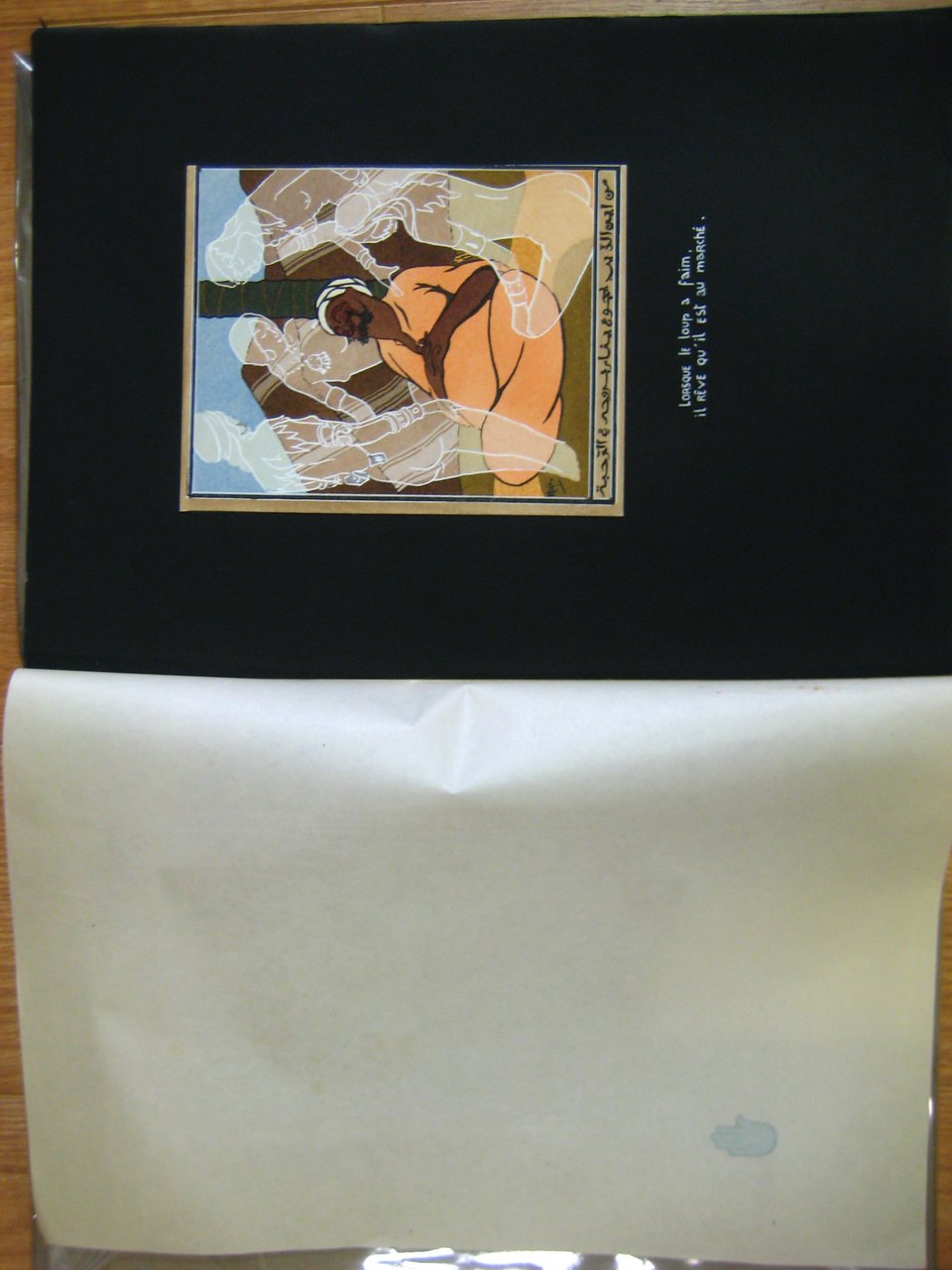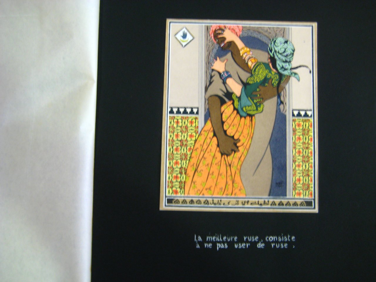 Sans lieu ni date 1920 Sans lieu ni date, vers 1920. Portefeuille In-folio 30 x 43 cms contenant 12 lithographies contrecollées de 16 x 20 cms, en couleurs rehaussées à la gouache et encre de Chine, signées MAP dans la planche, illustrant des proverbes arabes. Légende en arabe avec traduction en français sous la planche. Chaque planche, noire de papier Canson et Montgolfier - Vidalon les Annonay, sous serpente illustrée d'une main de Fatma en couleurs. "LORSQUE LE LOUP A FAIM, IL REVE QU'IL EST AU MARCHE" - "PEU VENANT D'UN AMI EST BEAUCOUP" - "LORSQUE TU VOIS DES FOURMIS DANS LES ESCALIERS, TU PEUX DIRE QU'IL Y A DES FOURMIS AU PREMIER ETAGE" - "QU'ALLAH FASSE PASSER CE QUI EST ECRIT, AVEC DOUCEUR" - "CELUI QUI A ETE MORDU PAR UNE VIPERE A PEUR MEME DE L'OMBRE D'UNE CORDE" - "LE DISCOURS EST UNE HYPOTHESE ET LES INTELLIGENTS COMPRENNENT" - "LA SUPPOSITION DU SAGE A PLUS DE VALEUR QUE LA CERTITUDE DU SOT" - "FAIS LE BIEN ET OUBLIE LE" - "UN PUITS VIDE NE S'EMPLIT PAS AVEC DE LA ROSEE" - "LA MEILLEURE RUSE CONSISTE A NE PAS USER DE RUSE" - "EPROUVEZ MOI ET VOUS SAUREZ CE QUE JE VAUX" - "LES DETTES DETRUISENT L'AMITIE" . Au 1° plat titre en arabe et , sous une main de Fatma également en couleurs, une citation de GAZINI "Connais tu la main du destin ? Le destin a cinq doigts. Qu'ils se posent sur toi et tu les connaitras. Deux pour les yeux, deux pour les oreilles. Son dernier doigt sur ta bouche dira : "TAIS TOI !". Dos du portefeuille légèrement abimé, lithographies en parfait état. Pacheco est né en 1899, il exposa en Algérie entre 1922 et 1924. Ensemble bien complet et rare.