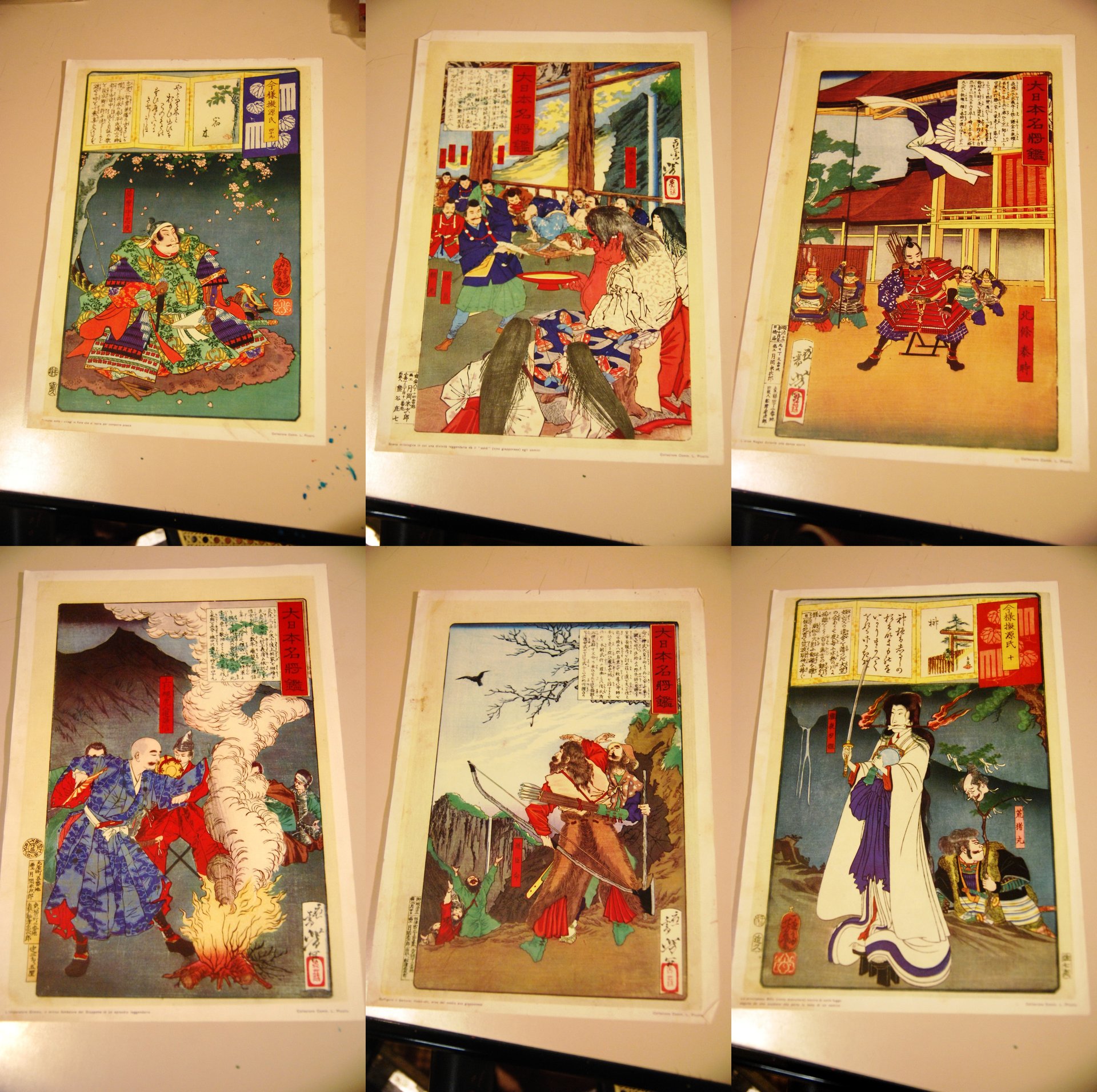 6 stampe giapponesi samurai sotto i ciliegi principessa bofu vento distruttore sakè eroe nagao imperatore gimmu hobu shi medio evo. collezione picollo .